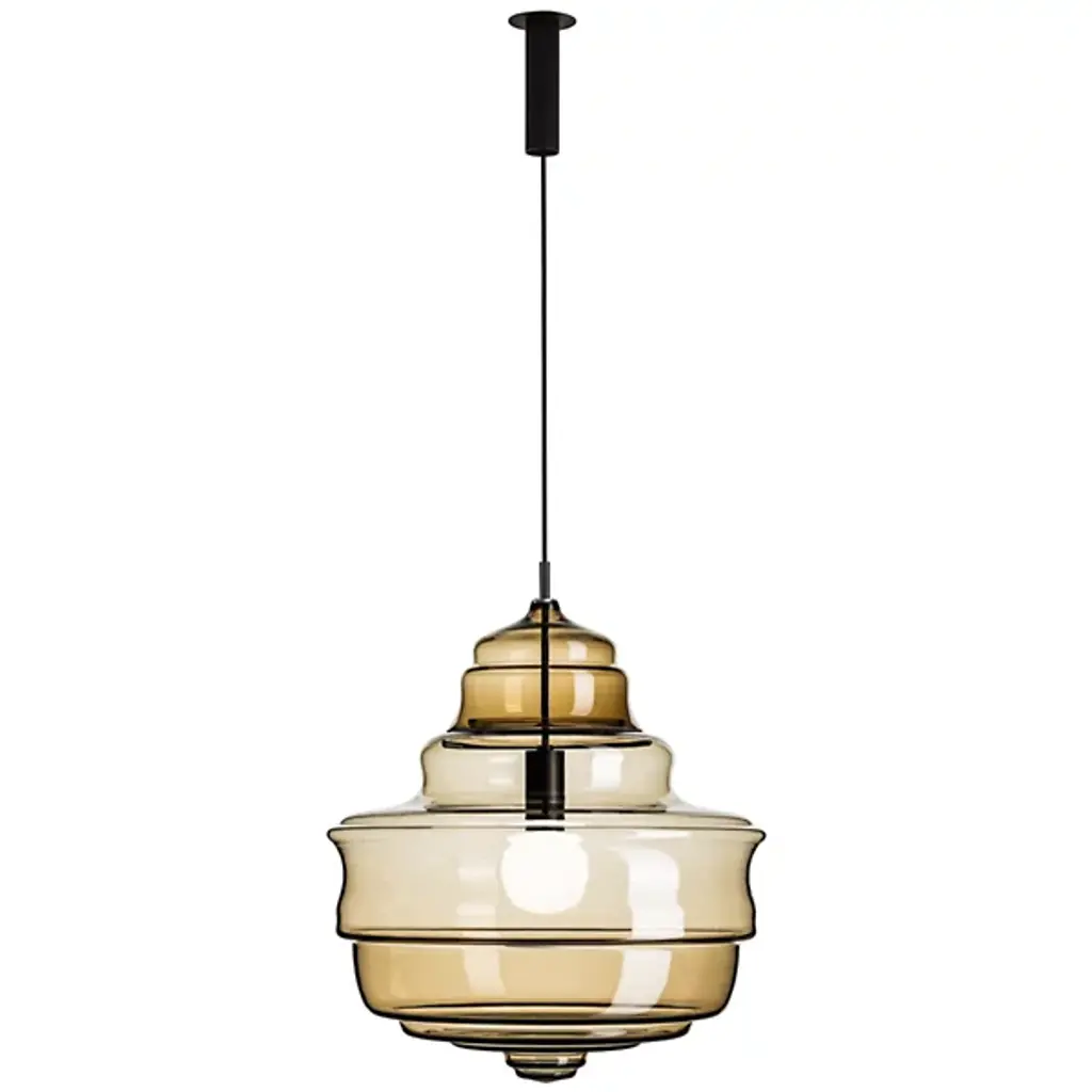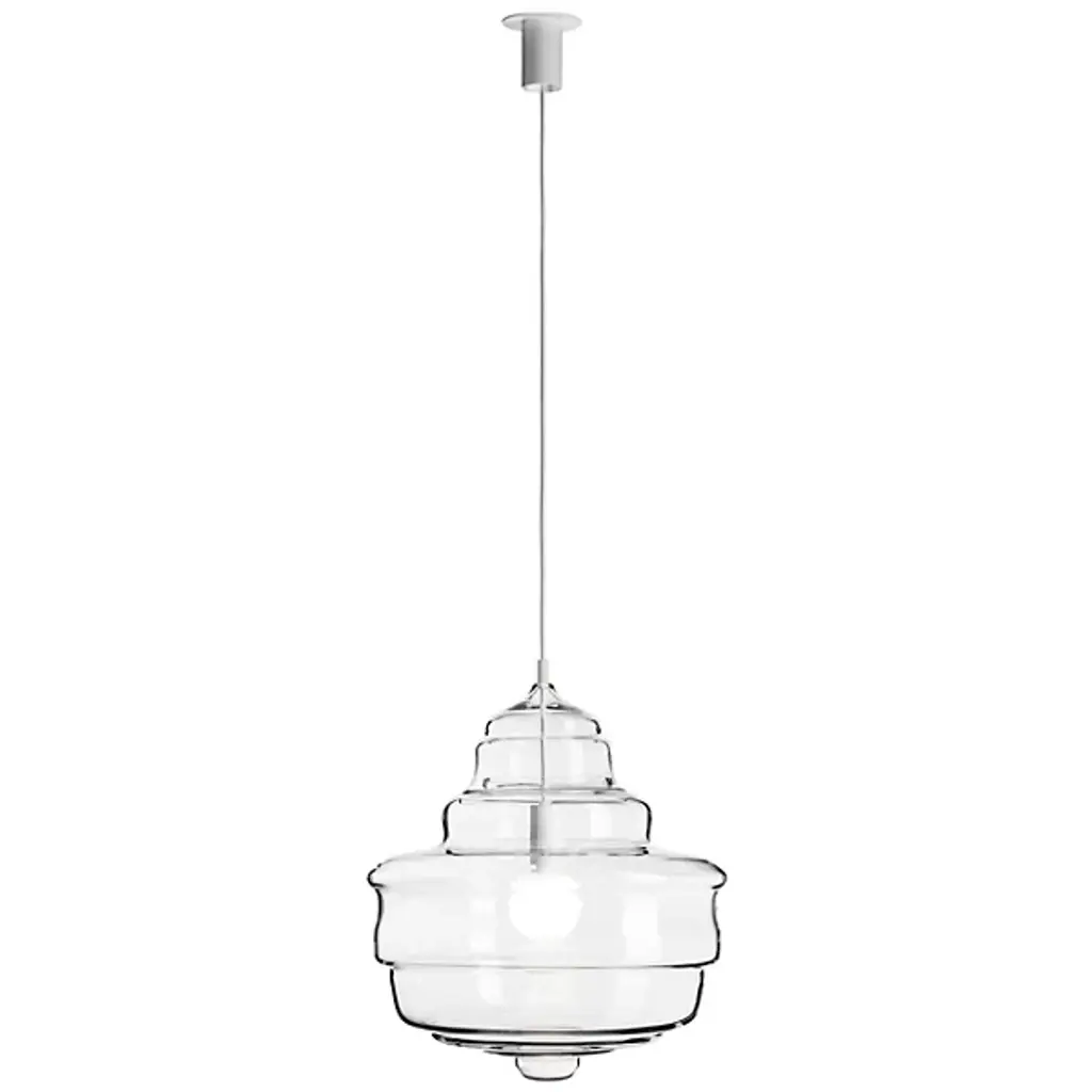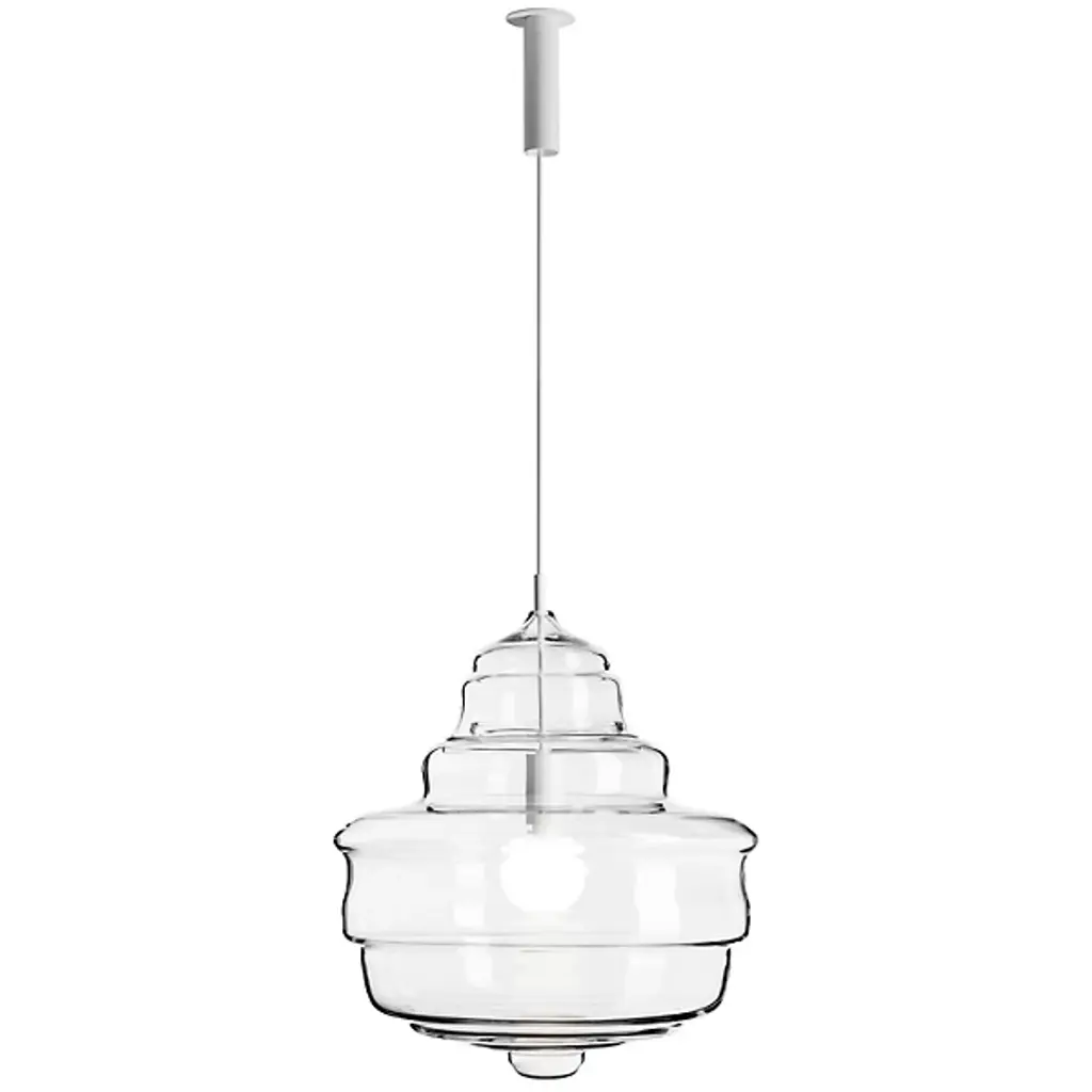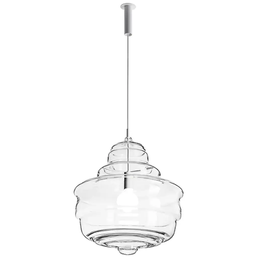 The Neverending Glory Palais Garnier Pendant by Lasvit is a striking design from Jan Plechác and Henry Wielgus that captures the striking silhouette of iconic chandeliers in a sizable build. This crafted glass pendant is made using a large wooden mold and finds its shapely silhouette thanks to rotating the shape of a chandelier found at the Palais Garnier in Paris around its own axis. This minimal interpretation of that design creates plenty of space for light to diffuse through, bringing the clean lines and curves exhibited throughout its build to life.