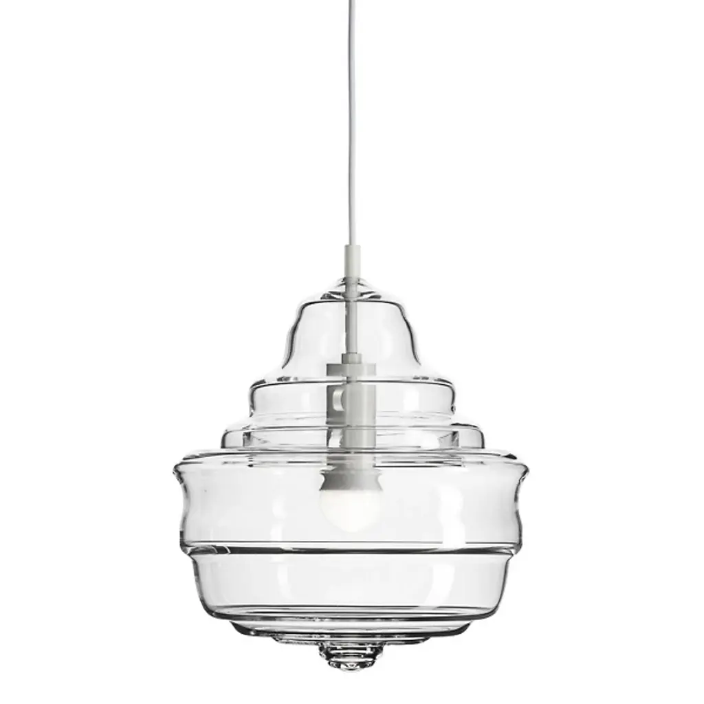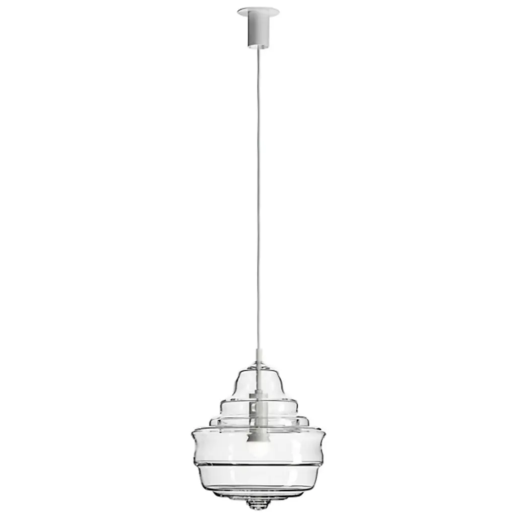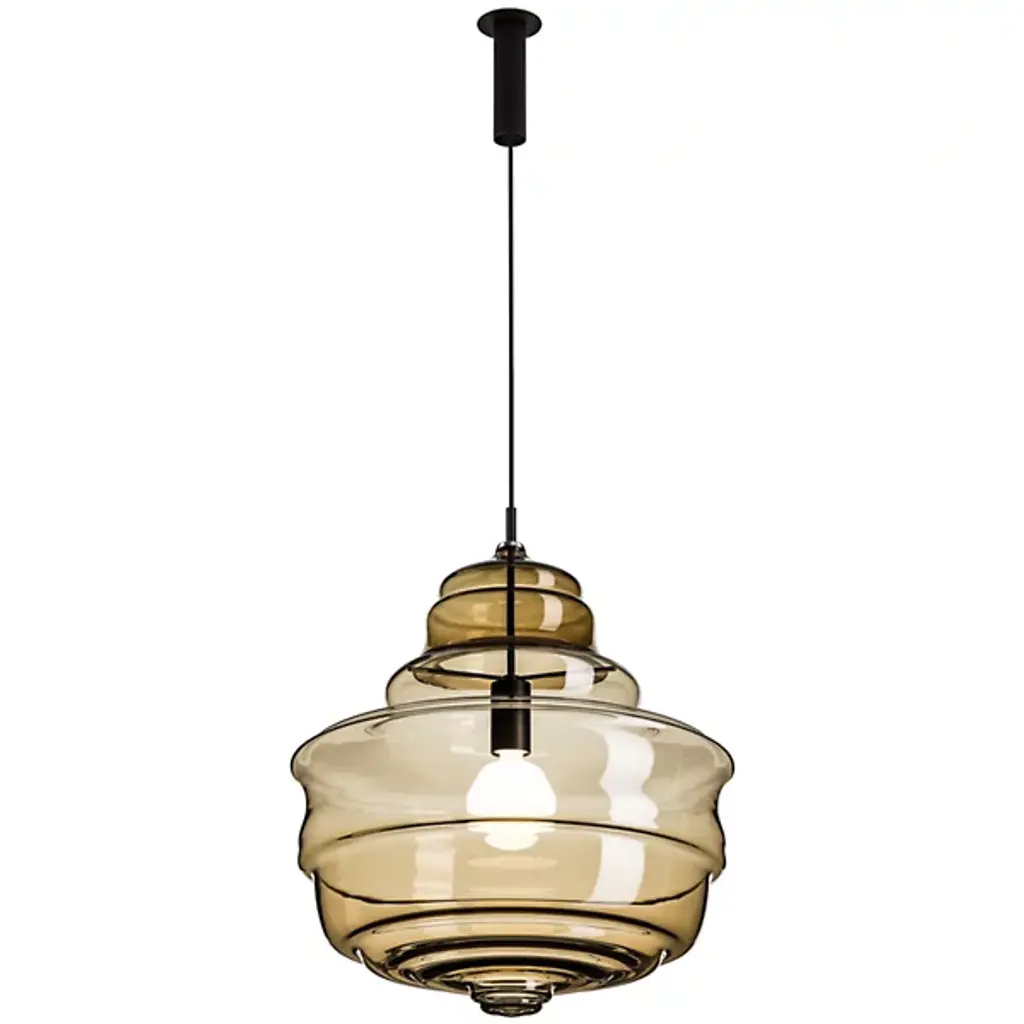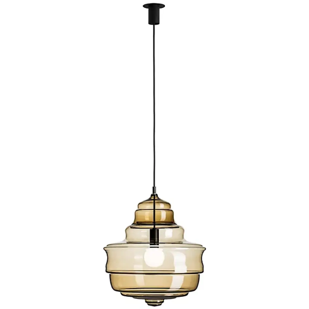 The Neverending Glory Palais Garnier Pendant by Lasvit is a striking design from Jan Plechác and Henry Wielgus that captures the striking silhouette of iconic chandeliers in a sizable build. This crafted glass pendant is made using a large wooden mold and finds its shapely silhouette thanks to rotating the shape of a chandelier found at the Palais Garnier in Paris around its own axis. This minimal interpretation of that design creates plenty of space for light to diffuse through, bringing the clean lines and curves exhibited throughout its build to life.