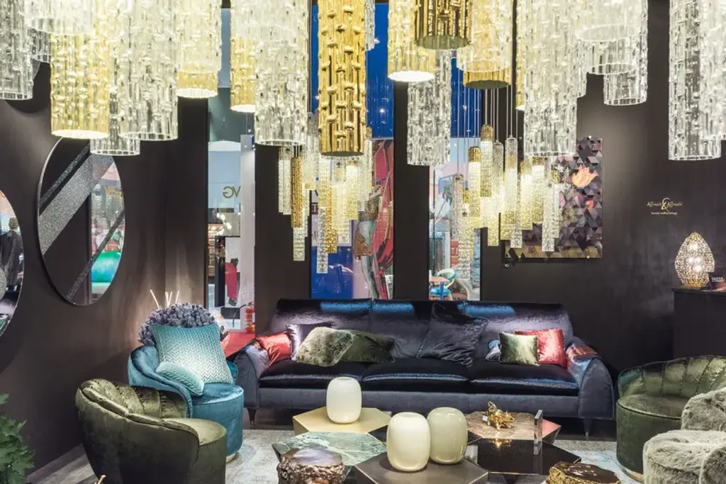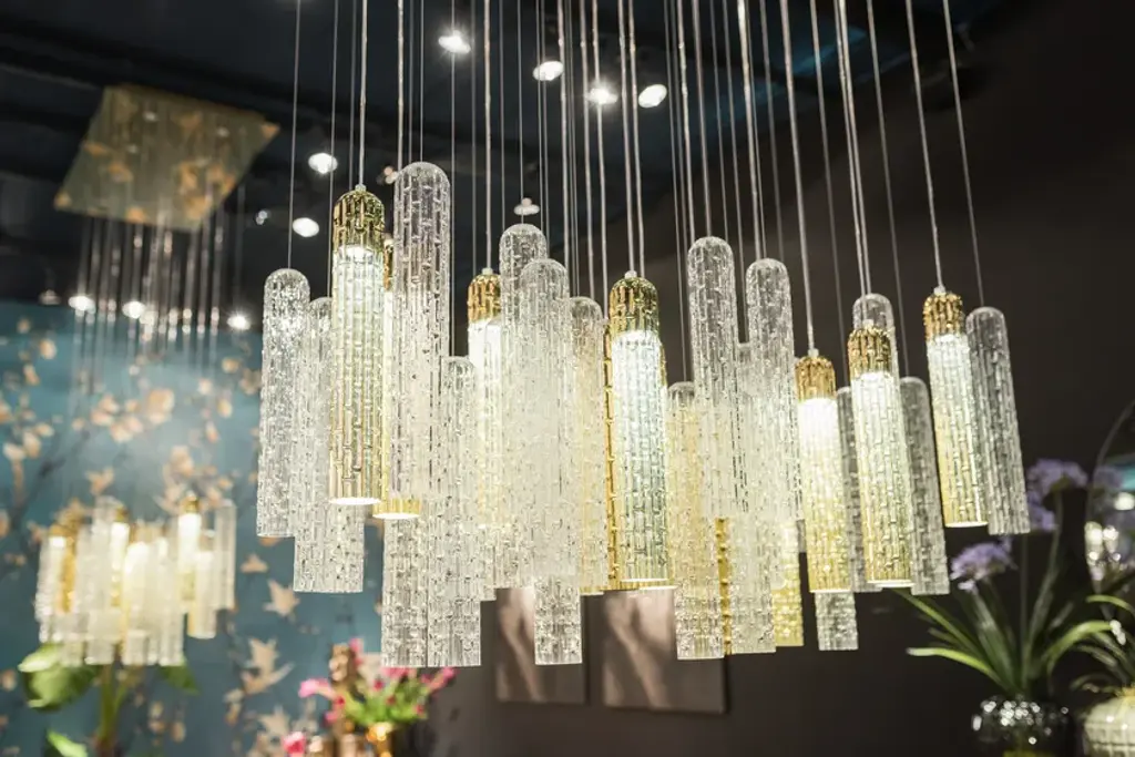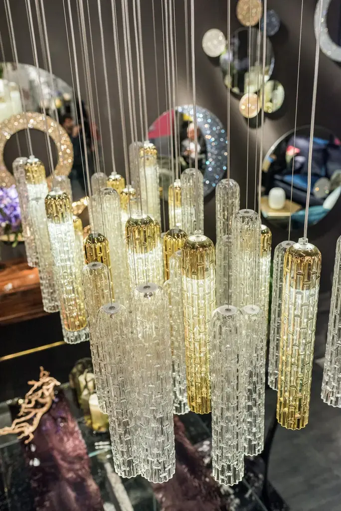 New Pipe is a chandelier made of pipes in Muranese glass, clear colour and 24k golden finish respectively.Fixing plate, painted gold finish. LED lighting, both through spotlights recessed in the plate (LED 60° GU10 - 7W) and through pipes fitted with bulbs (LED 36° GU10 - 7W).