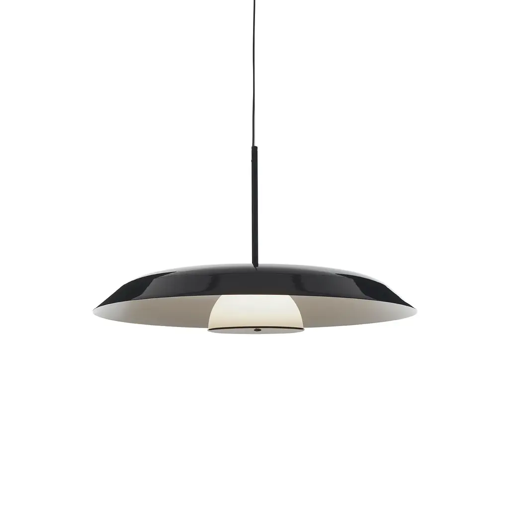 Suspension lamp system with aluminum body, supported by a 3 or 10 m cable. The light is direct and the source is set back and possibly shielded by an opal glass, so as to ensure a pleasant, non-dazzling effect. The Newton lamp is supplied with white light 2700K, 3000K or 4000K, and on request with a reflector with optical apertures of 24° and 58°. Also available in golden satin and satin nickel.
