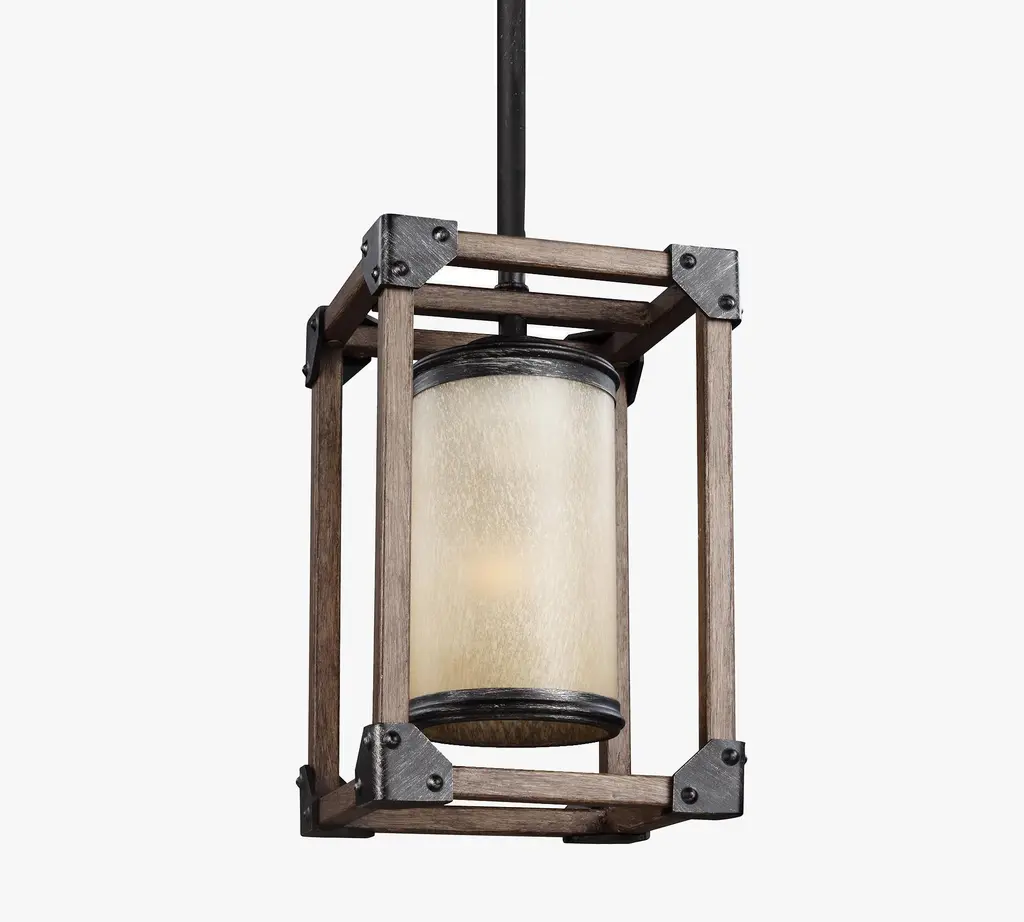 Rustic-farmhouse style meets industrial design in this handsome pendant. An open, geometric frame nods to crafted wood beams with its weathered, hand-painted finish that beautifully offsets the two-tone joints, holder and stem. The cylindrical parchment-glass shade with delicately veined surface adds an organic vibe and beautifully brightens entryways, bedrooms and dining areas.