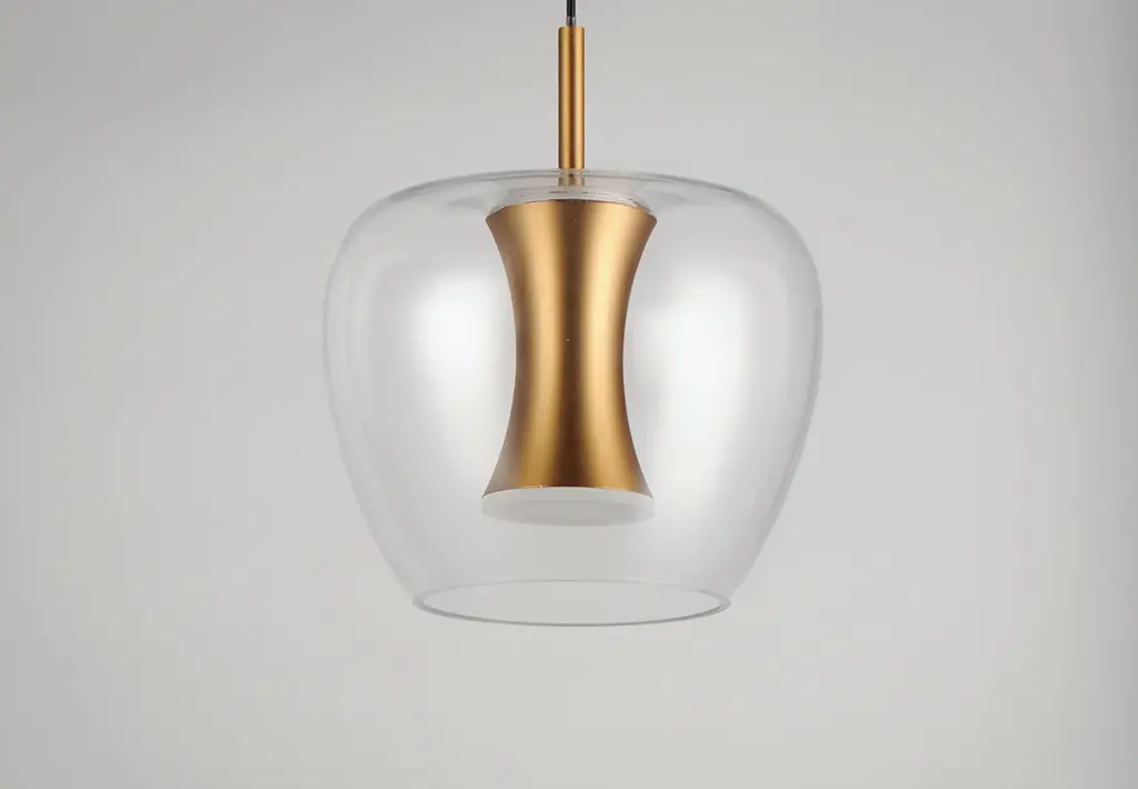 Clear apple shaped glass rest on machined aluminum fonts finished in Satin Brass with integrated LED for even Illumination without the glare. The large scale 25 light comes pre-arranged for ease of installation and is perfect for that tall ceiling application.