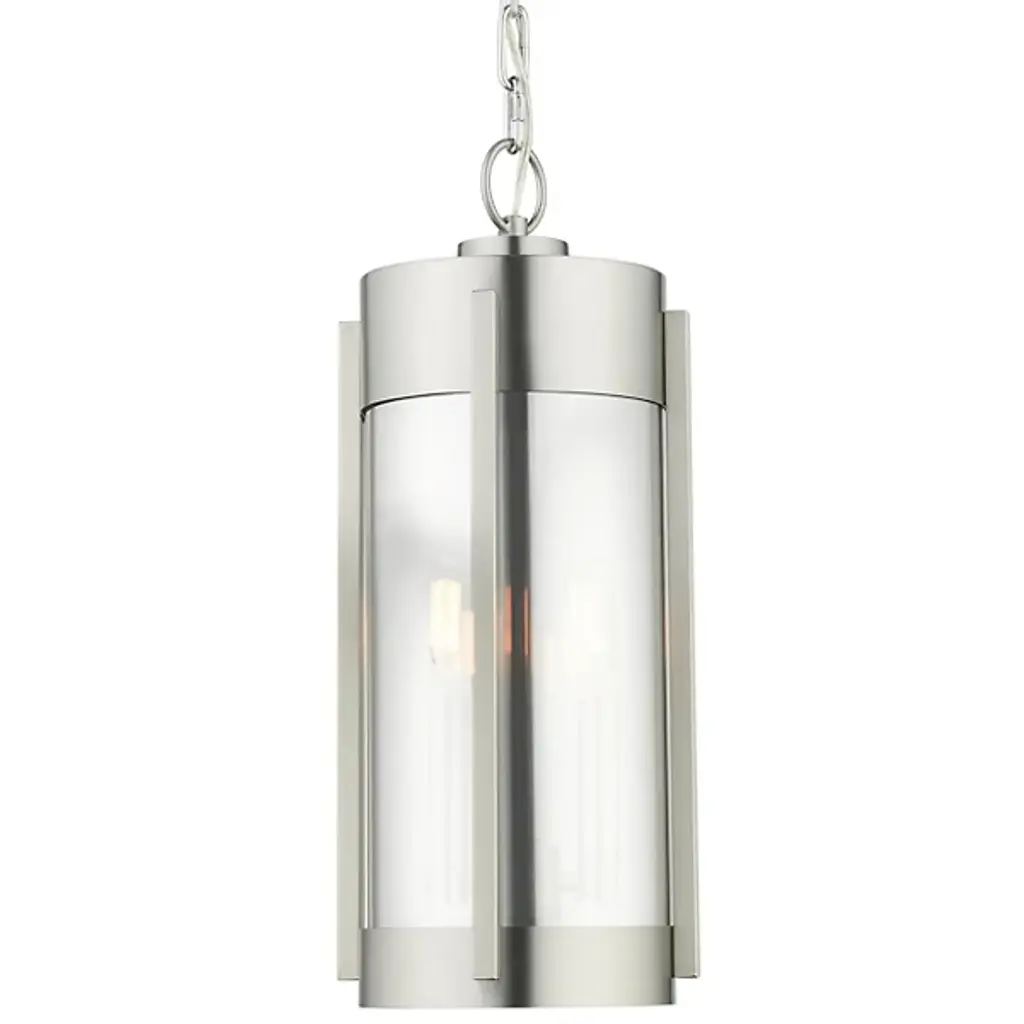 The Nicholas Outdoor Pendant by Alder & Ore has a clean, crisp, contemporary look that brings a welcoming presence and bright touch to patios, porches, and other exterior locations. A linked chain and simple canopy give this piece a classic foundation as they support a cylindrical frame that visually divides itself with structured lines. Within this frame, a glass shade softly filters the light from the concealed sources set inside of this pendant, illuminating the silhouette of this design and the environment around it.