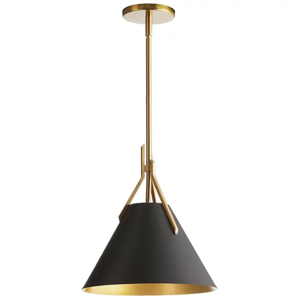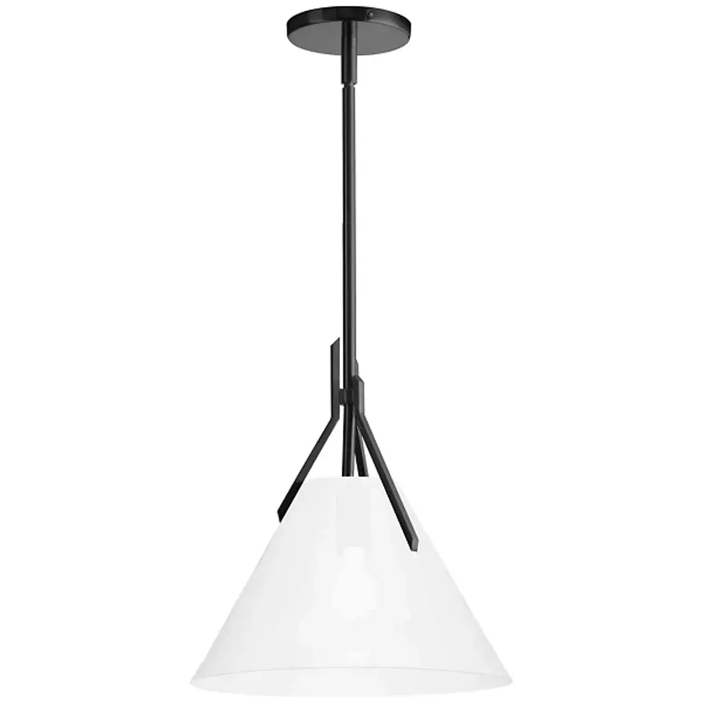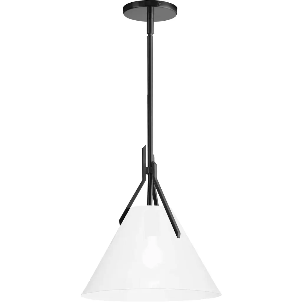 Elegantly sharp and clean pendant lighting design. The Nicole Pendant by Dainolite features a widely flared shade at the end of a sloped ceiling-friendly rod-hung suspension. Metal bars of different lengths accent the rod and then bend precisely to extend over and accent the shade. Such pointed details help to create an eye-catching look over a kitchen island or dining table, as the pendant projects a bright wash of direct downlight.
