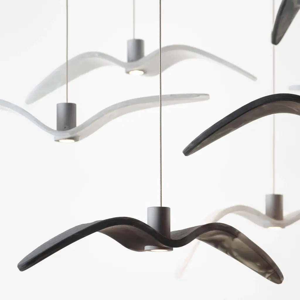 Let your interiors take flight with the Night Birds Mini LED Pendant Light from Brokis. Designed by Boris Klimek in the Czech Republic, this elegant fixture features slender cables descending from a stepped circular ceiling mount, each ending in a sleek cylindrical housing. Translucent glass accents shaped like delicate wings emit a soft, glowing light that captures the graceful motion of flight, adding a refined and artistic touch to any space. Highlights