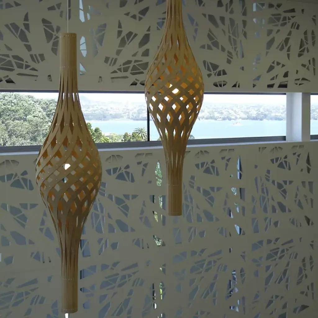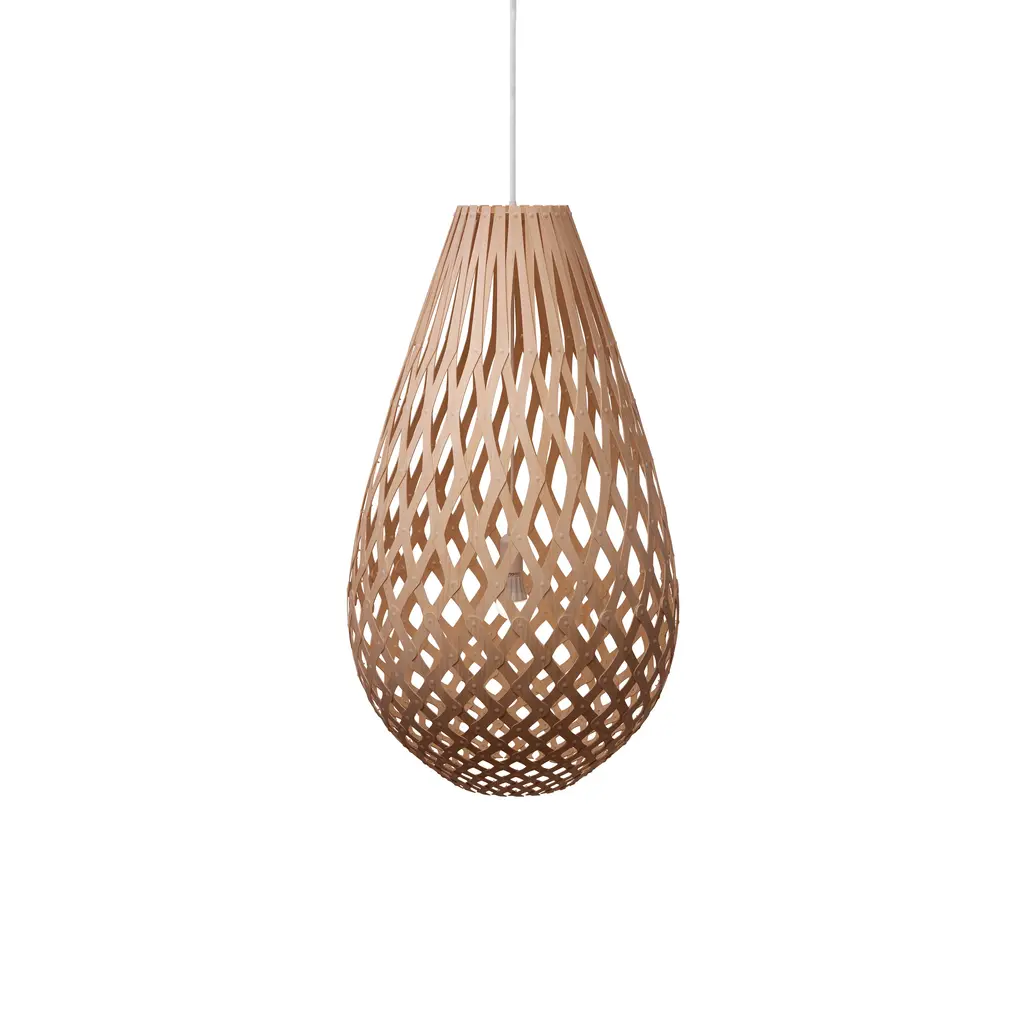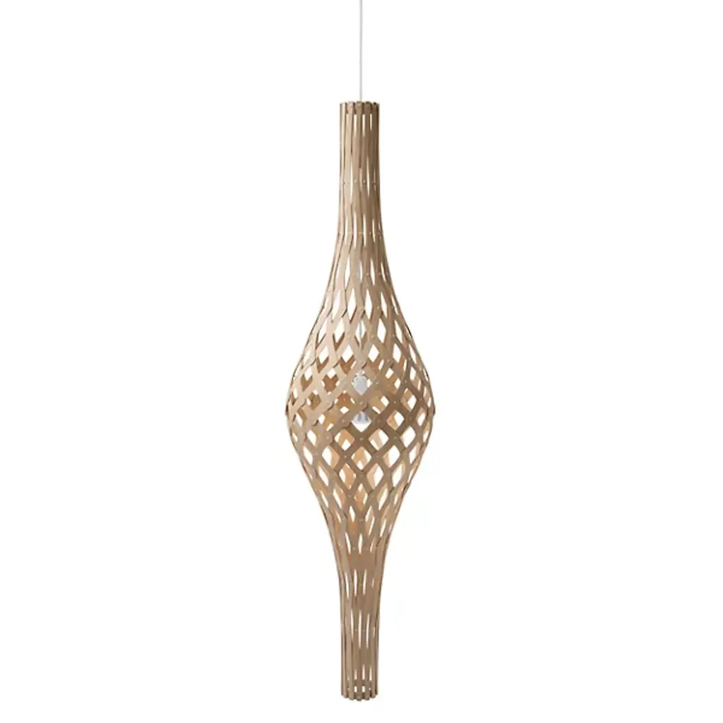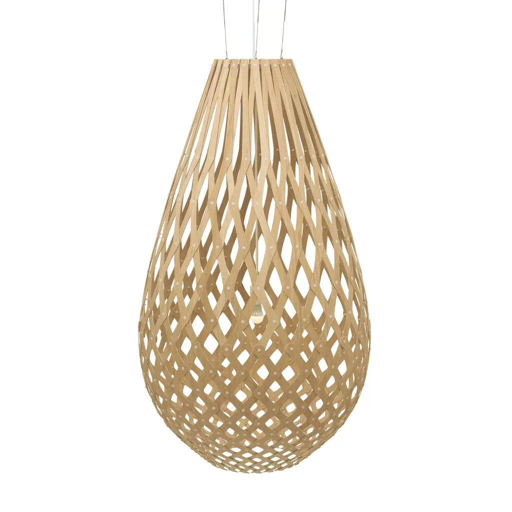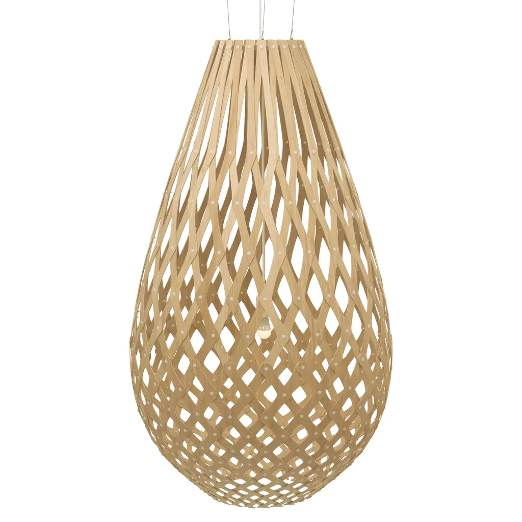 Named for the native New Zealand palm tree, the David Trubridge Nikau Pendant pays tribute to that tree's lanky height and distinctive bulbous crownshaft. The tree's form is recreated here out of sweeping bands of Natural Bamboo bounded together with aluminum rivets. The final piece is nearly six feet long, particularly impressive in tall spaces.