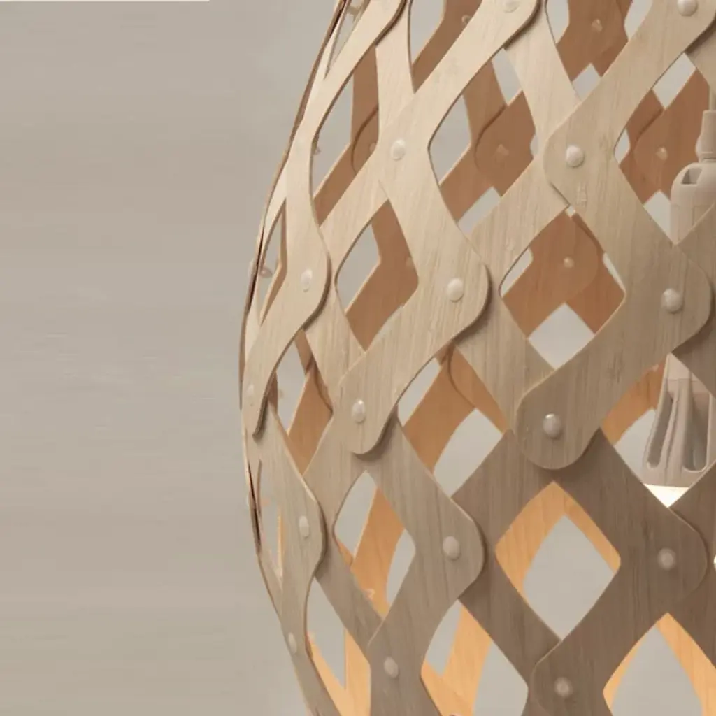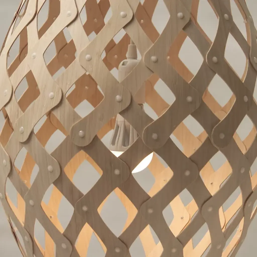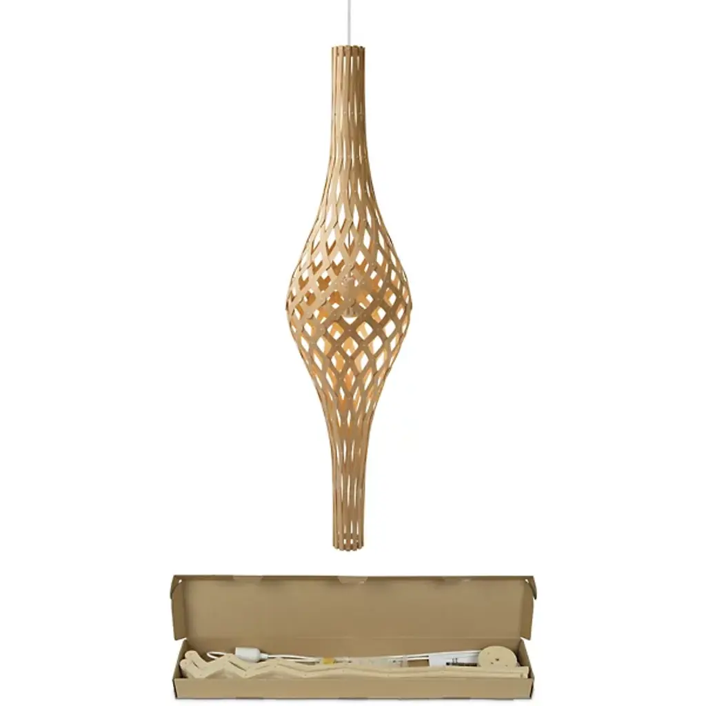 Named for the native New Zealand palm tree, the David Trubridge Nikau Pendant pays tribute to that tree's lanky height and distinctive bulbous crownshaft. The tree's form is recreated here out of sweeping bands of Natural Bamboo bounded together with aluminum rivets. The final piece is nearly six feet long, particularly impressive in tall spaces.