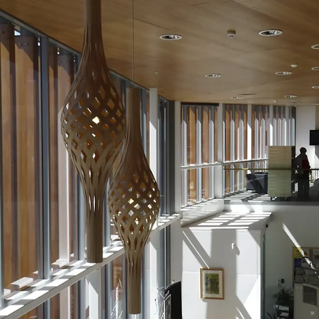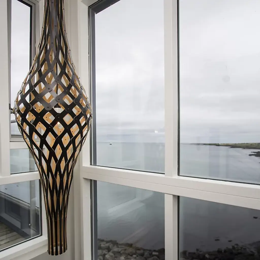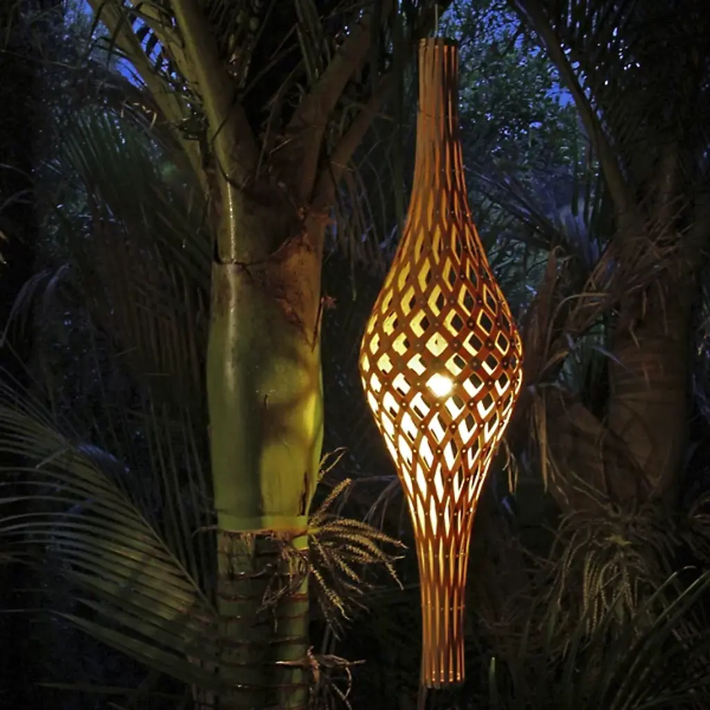 Named for the native New Zealand palm tree, the David Trubridge Nikau Pendant pays tribute to that tree's lanky height and distinctive bulbous crownshaft. The tree's form is recreated here out of sweeping bands of Natural Bamboo bounded together with aluminum rivets. The final piece is nearly six feet long, particularly impressive in tall spaces.