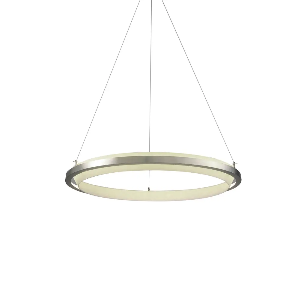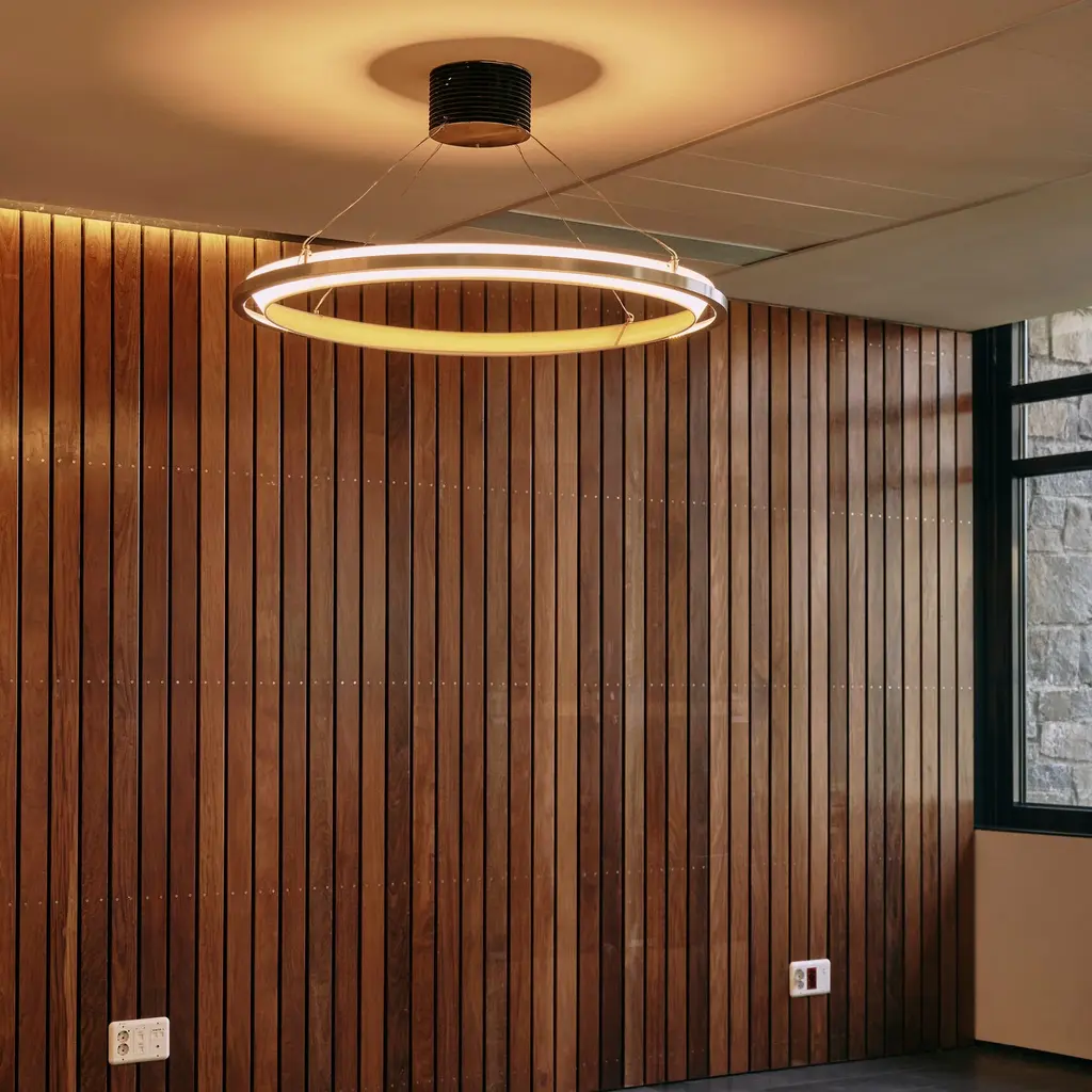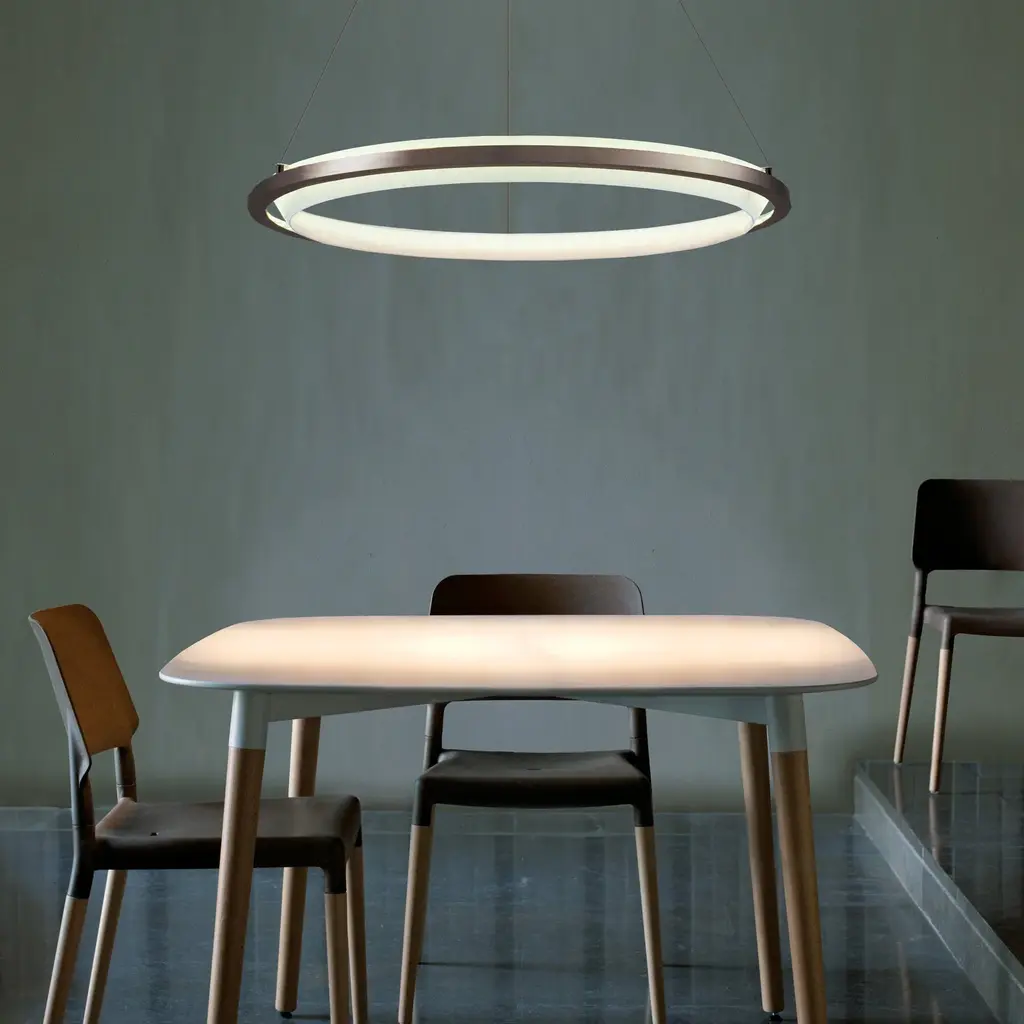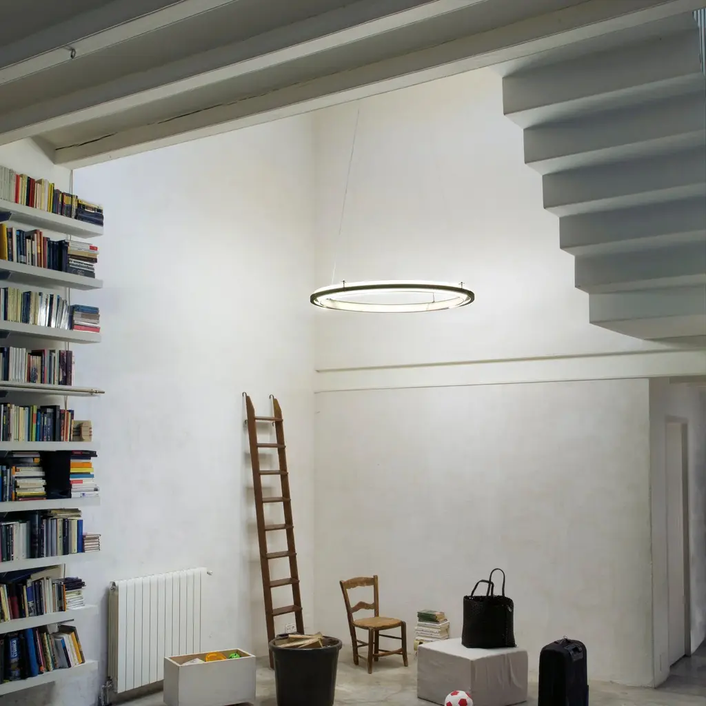 Nimba offers a floating halo of light that disperses illumination in all directions without glare. The luminous ring was first designed by Antoni Arola at the end of the '90s, with a metal profile that houses the built-in LED and an inner shade for a diffused glow. Available in 4 ascending diameters, the stainless-steel structure is finished with either a colorless or gold varnish, seamlessly combining a classically essential form with the best of modern technology.