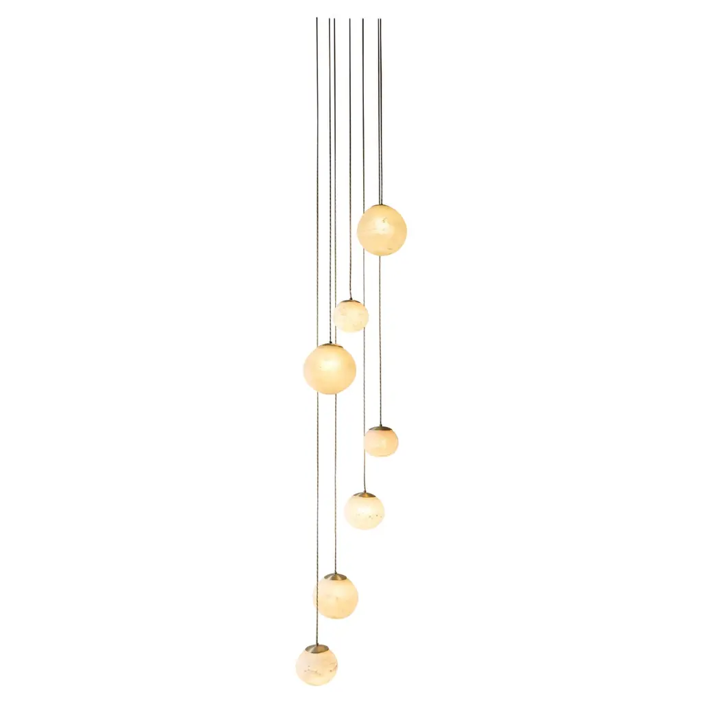 Enhance interiors with the delicate drape of the Nimbus 11 Multi-Light Pendant from Shakuff. Like other fixtures in the Nimbus family, this one is ideal for airy, open spaces and descends from a stepped canopy along slim wires, terminating in bright LED lamping emplaced inside a diffuser orb shade of blown glass. The artful dimples on each cloudlike shade make it distinct from any others used in an evenly-spaced sequence, casting a sparkling, individual ambiance out around the fixture.