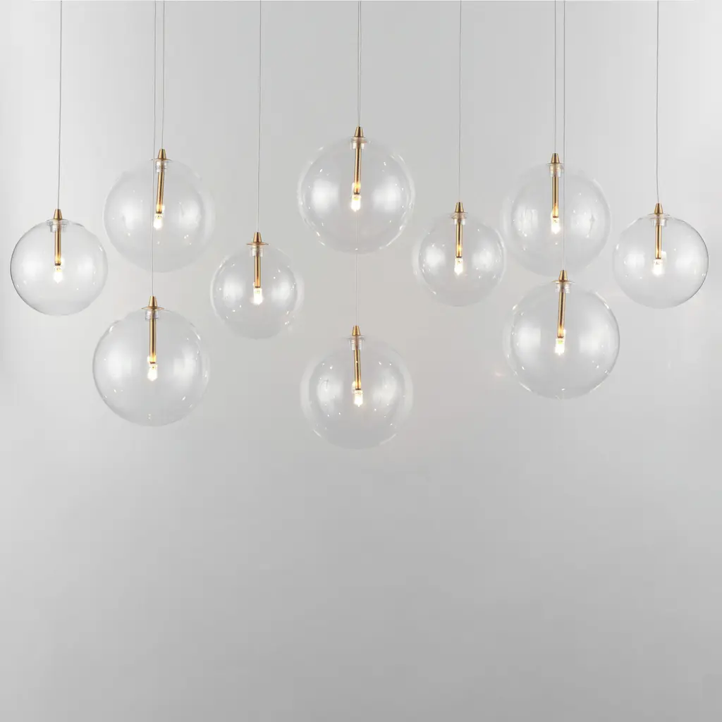 Oblong glass globe shades feature a intriguing Marble swirl pattern that obscures the integrated LED lighting within. Thin black electrical cords are easily adjustable. A larger oval 8-Light configuration features multiple sizes of the glass to create an interpretative congregation of clouds. Also available as a 3-Light, 5-Light and single pendant.