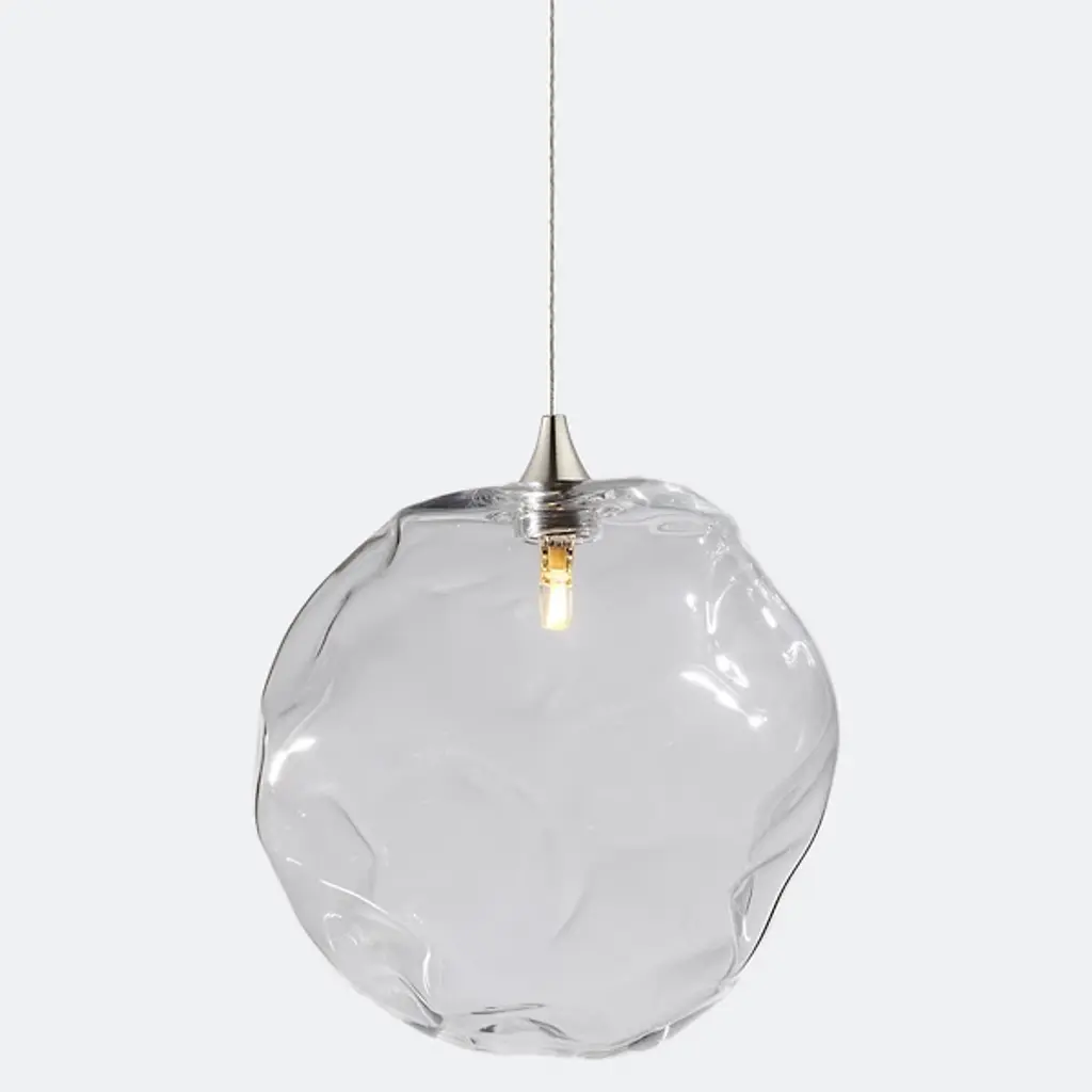 Bring a stately, considered appeal to inside spaces with the Nimbus Mini Pendant from Shakuff. A clever contemporary fixture with a cloudlike character, it descends from a low-profile canopy along a single slender cable, terminating in a small, strong LED lamp held inside an orb shade of blown glass. While the fixture works well alone or as part of a larger installment, each shade is crinkled inward to give each pendant an intricate texture and an individual appearance when used in proximity to its fellows.