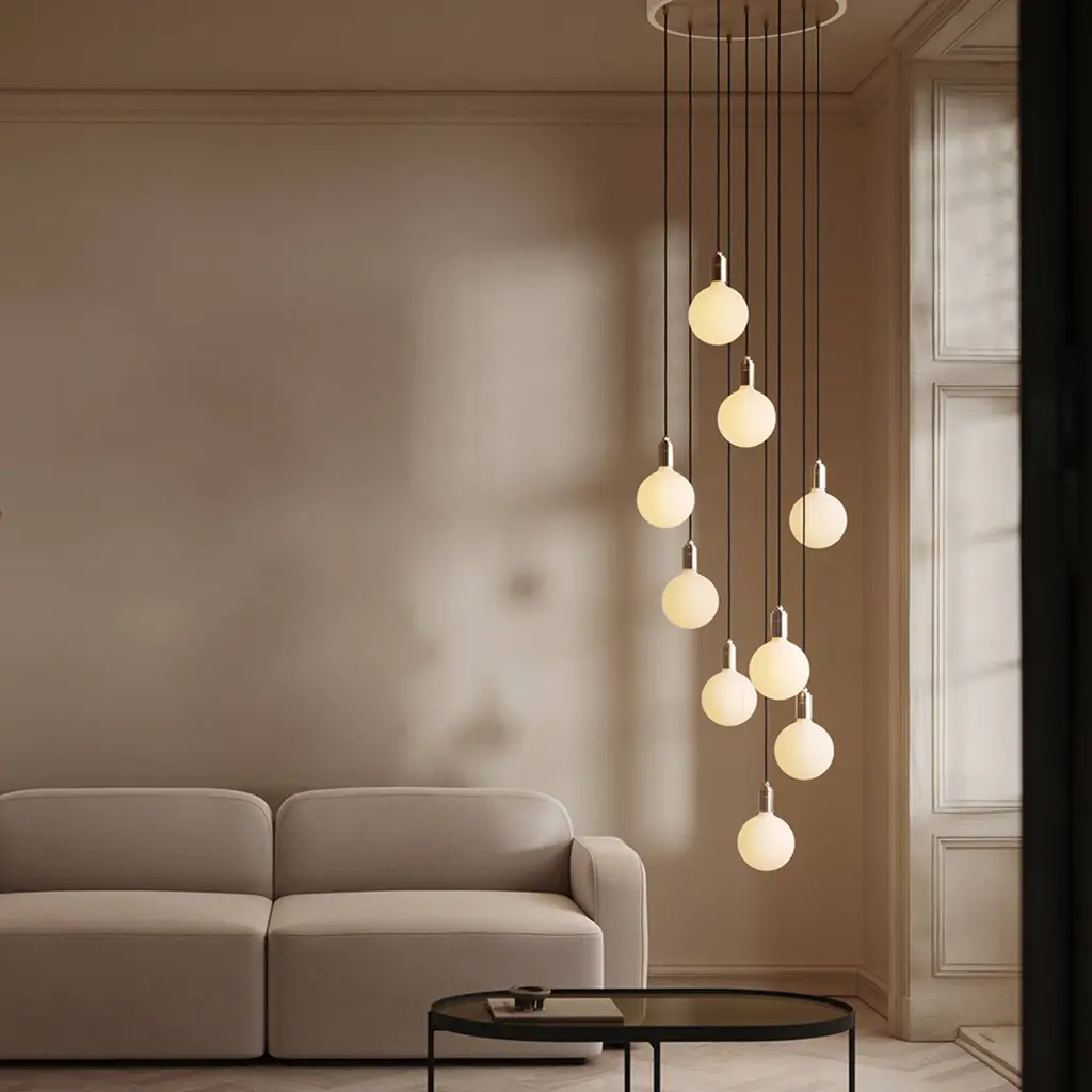 Tala's oversized matte-finish Sphere IV bulb creates a dramatic impact when multiplied in Nine's staggered display. Suspended from a powder-coated ceiling round, the pendants are available in a choice of metal or wood finishes and make for a hassle-free, all-in-one lighting solution for the home, workspace or contract spaces. With Dim to Warm technology, Nine offers radiant and generous LED illumination as well as visual aplomb.