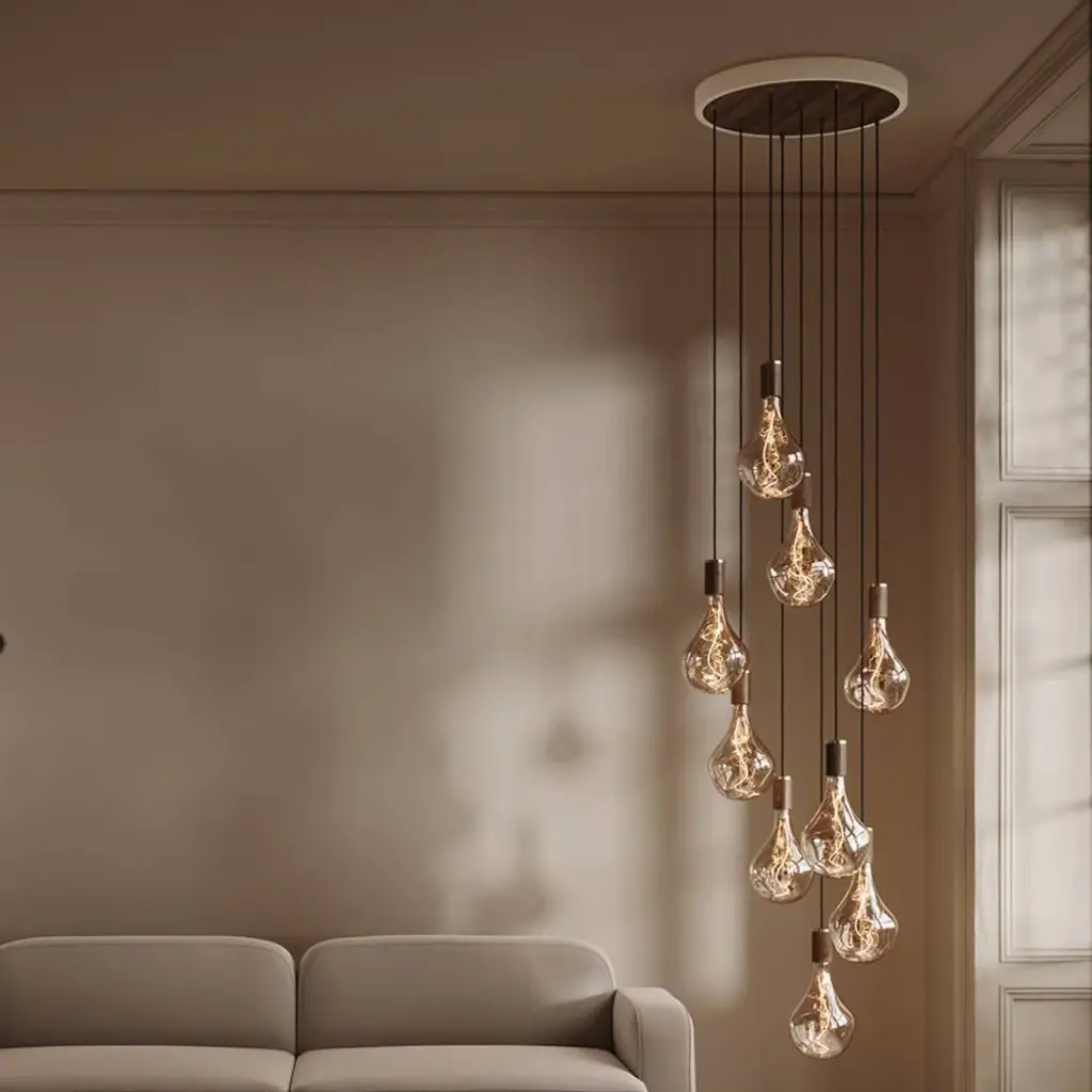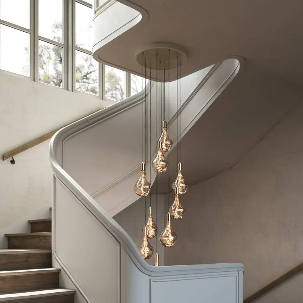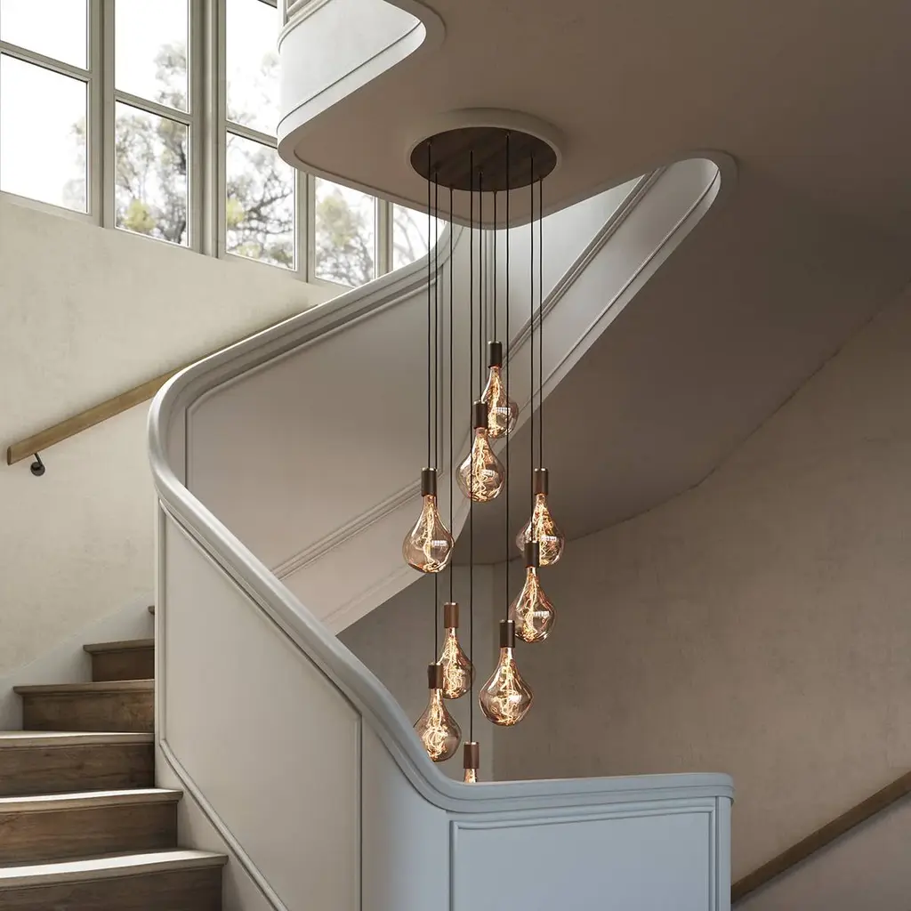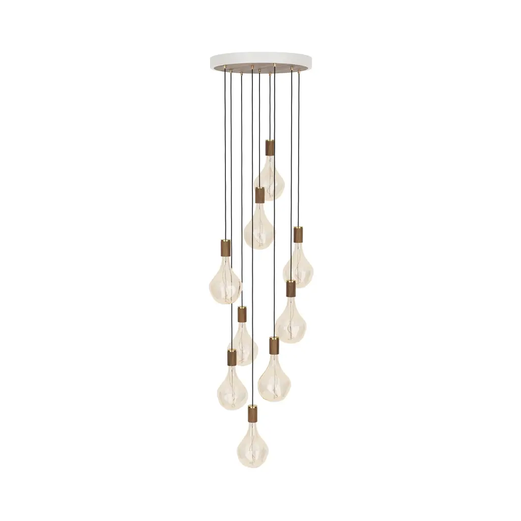 Nine combines an eye-catching array of staggered pendants complete with Tala's mouth-blown Voronoi II bulbs with their sculpted glowing translucence. Suspended from a powder-coated ceiling mount, the individual lights come in select metal or wood finishes and together comprise an efficient all-in-one lighting solution for the home, workspace or contract spaces. With proprietary Dim to Warm technology, the LED lighting level can be precisely adjusted to the desired illuminated effect.