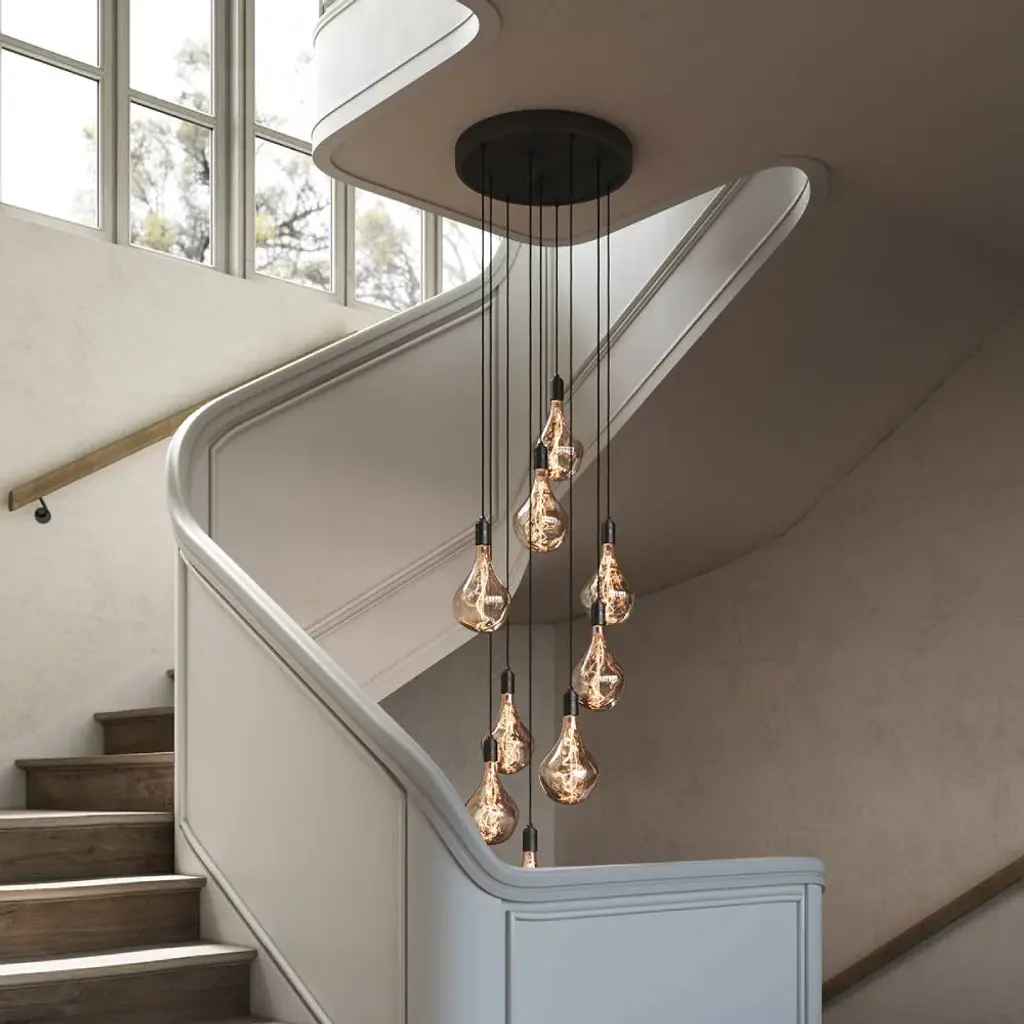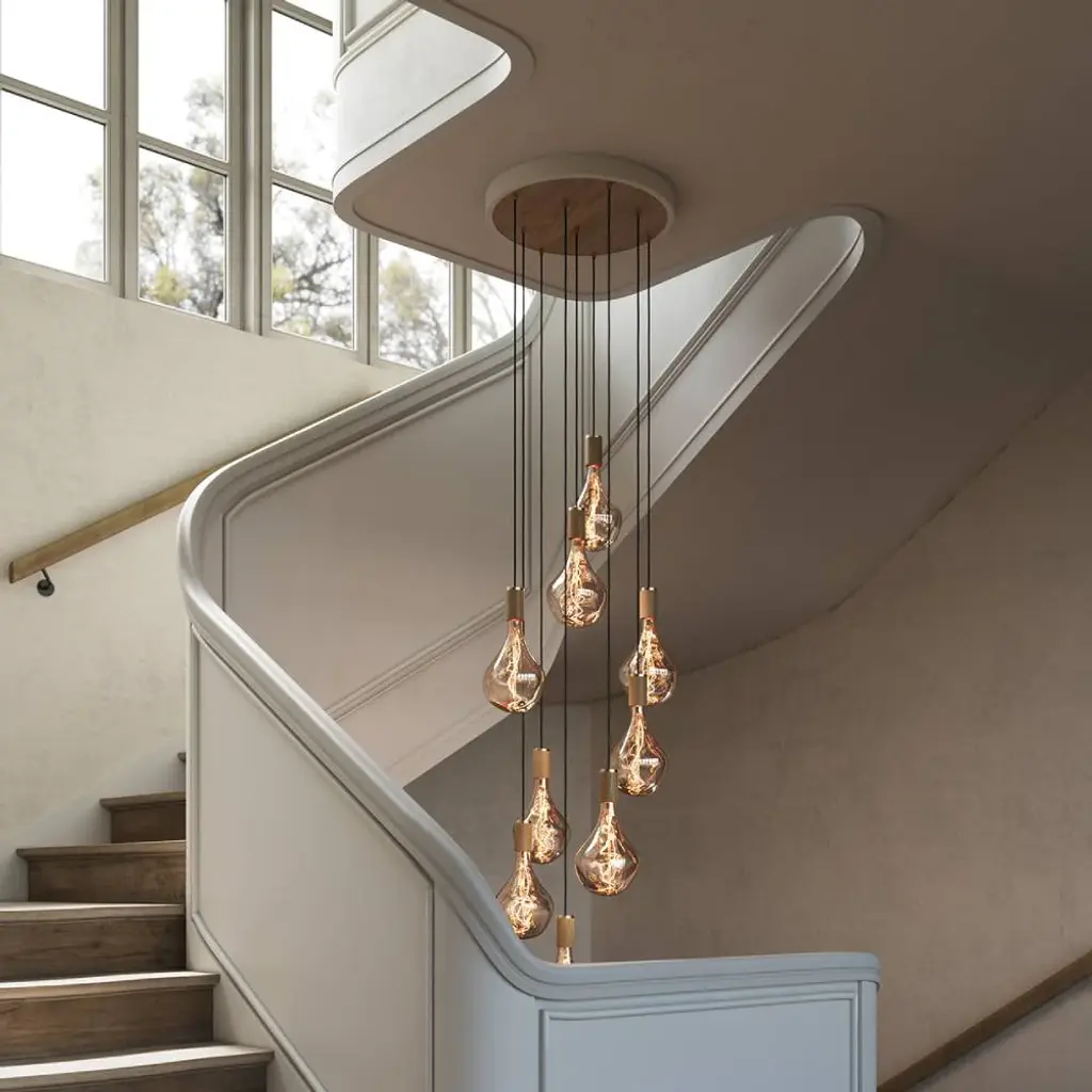 Nine combines an eye-catching array of staggered pendants complete with Tala's mouth-blown Voronoi II bulbs with their sculpted glowing translucence. Suspended from a powder-coated ceiling mount, the individual lights come in select metal or wood finishes and together comprise an efficient all-in-one lighting solution for the home, workspace or contract spaces. With proprietary Dim to Warm technology, the LED lighting level can be precisely adjusted to the desired illuminated effect.