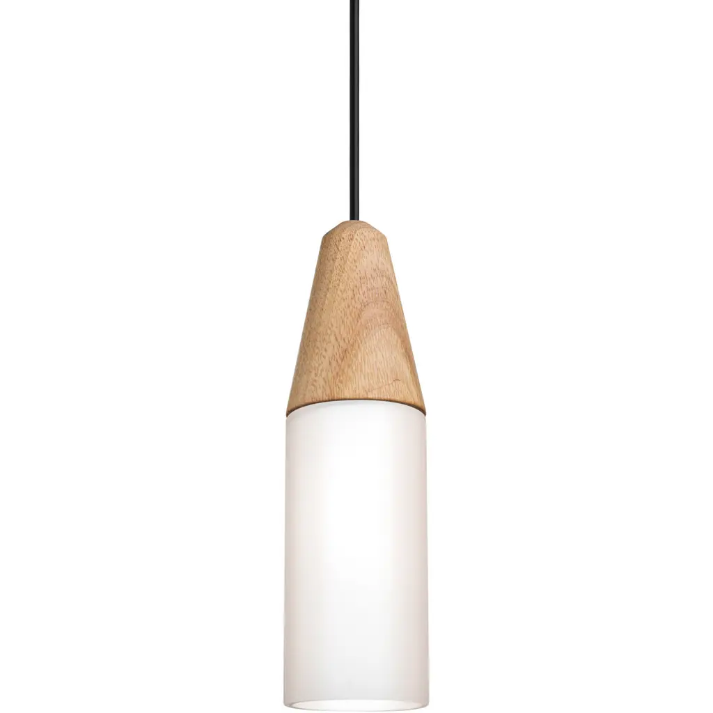 The Nini Natural Pendant beautifully melds wood and European glass, with the top conical wood cap turned from real Ash by hand and then clear coated. The glass cylinder is produced from triple layer opal for softly diffusing the light source, complementing the warmth of the wood sublimely. The cord pendant fixture is equipped with a 10' SVT cordset and an low profile flat monopoint canopy. These stylish and functional luminaries are offered in a beautiful Satin Nickel finish.