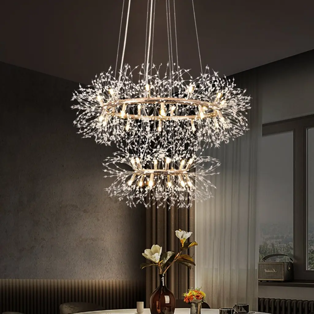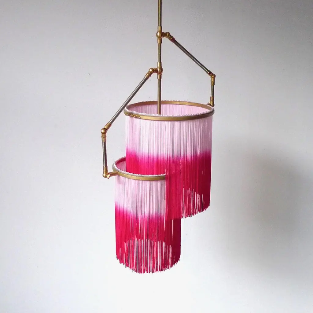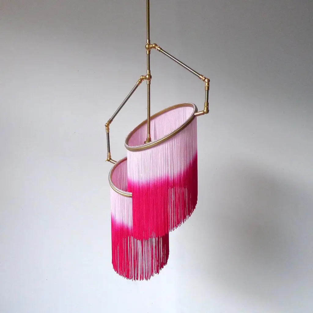 Pink Charme pendant lamp, Sander BottingaDimensions: H 45 (can be customized) x W 38 x D 25 cmHand-sculpted in brass, leather, wood and dip dyed colored fringes in viscose.The movable arms makes it possible to move the circles with fringes in differed positions.So you can change the light object in multiple models.The brass lamp base, lamp holder and dimmer are inlaid with leather.The design artwork is meticulously handcrafted in a limited series, sometimes in corporation with small artisan workshops.All our lamps can be wired according to each country. If sold to the USA it will be wired for the USA for instance.