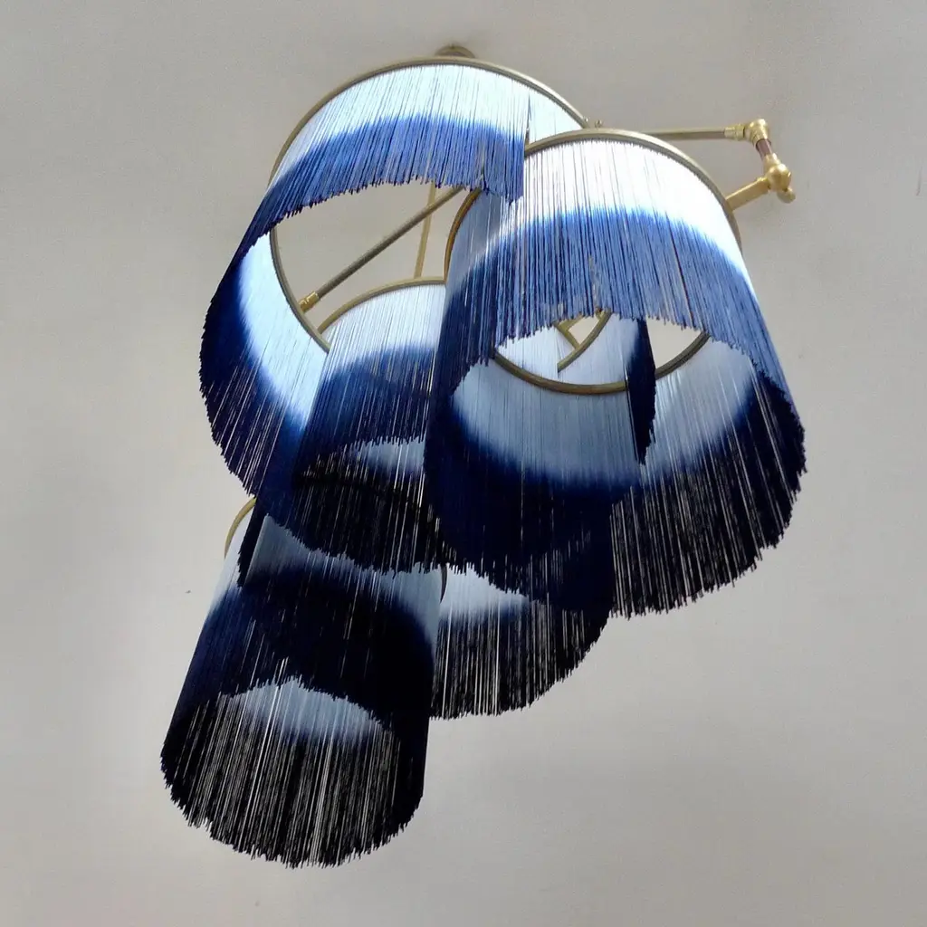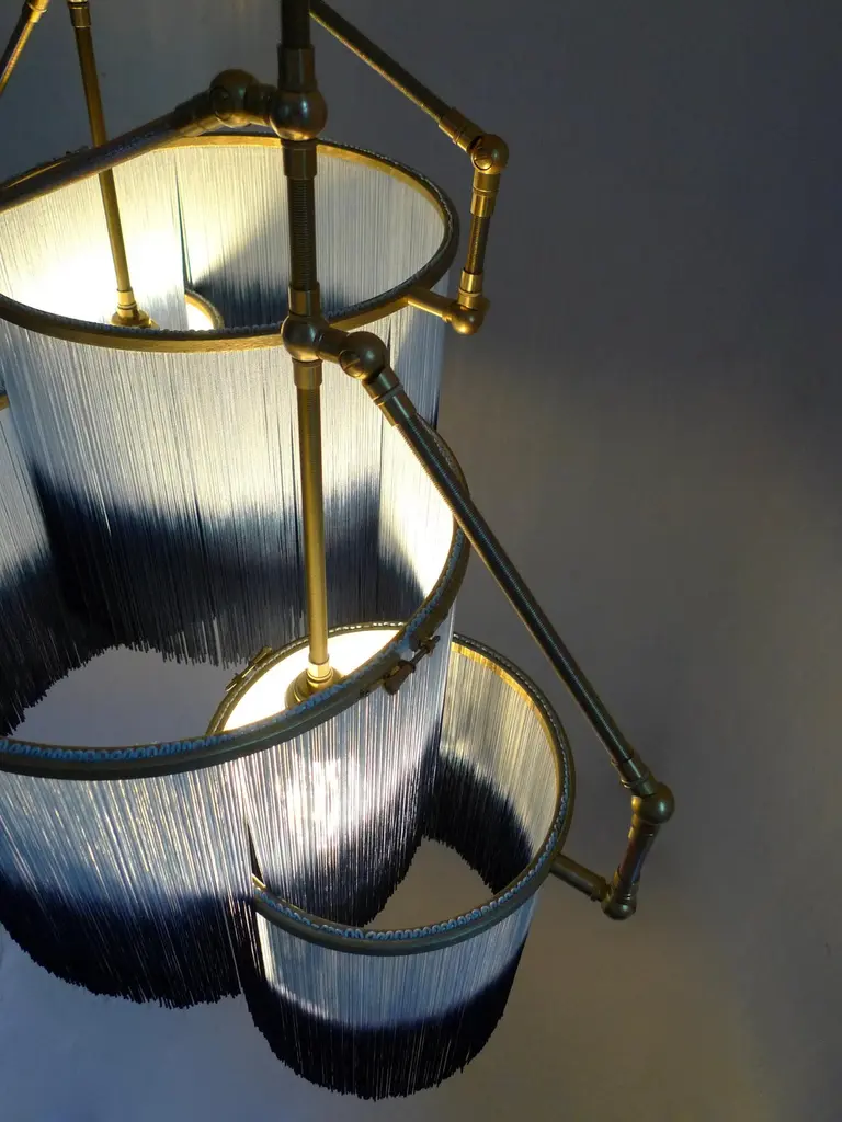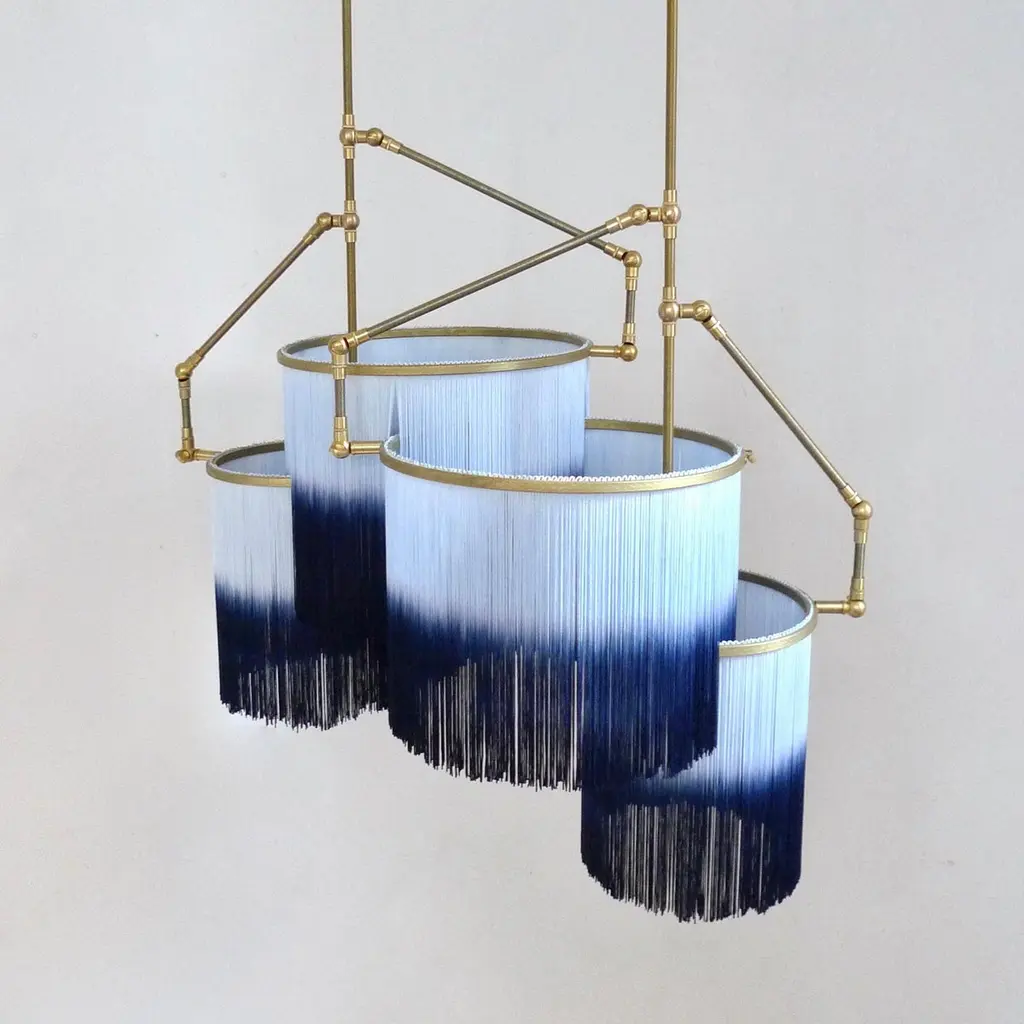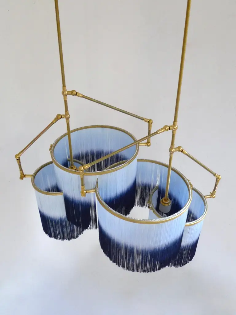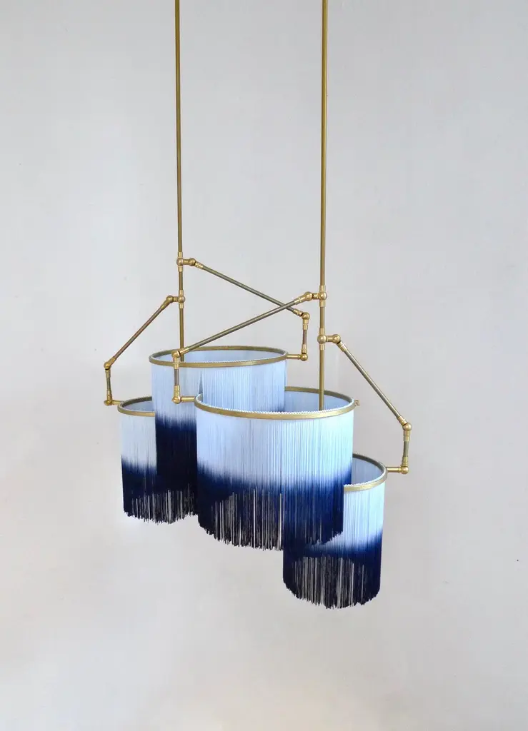 No. 31 C pendant lamp by Sander BottingaDimensions: W 68 x D 44 x H 50 cm.Materials: brass, leather, wood. Deep dyed color fringes in viscose.Also available in dark yellow and light yellow, green and light green, blue and light blue, reddish pink and light pink, brown and off white.Custom size for the height from ceiling to bottom. Only for Led light bulbs. This composition is made out of 2 pendants and can be extended with more pieces together in a length, wide or height composition. The design artwork is meticulously handcrafted in a limited series, sometimes in corporation with small artisan workshops.All our lamps can be wired according to each country. If sold to the USA it will be wired for the USA for instance. Sander BottingaObject / Interior DesignerI’ve always been inspired by light objects, forms, colors and authentic materials. I love to create and work with my hands.After working for various interior and design companies in the last 20 years, I have now designed my own collection of interior objects.All the objects are meticulously handcrafted in a limited series, sometimes in corporation with small artisan workshops.This results in unique handmade objects with their own identity. There is also the option to order custom-made objects – for both projects and personal use.