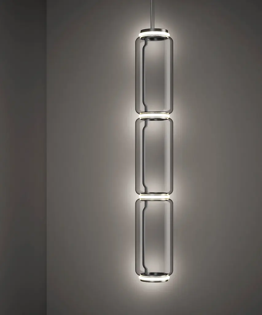 Interior Design's 2019 Best of Year Awards Winner Another pioneering lighting design in the array of lamps and lighting fixtures FLOS is known for, Noctambule LED dimmable pendant light with tall cylinders is one of designer Konstantin Grcic's finest creations. Adaptable to any interior space, this dynamic fixture can be configured as a pendant lamp or standing light using the additional components available with the product. Inspired by night owls, Noctambule by Konstantin Grcic features a transparent body that almost blends into a room when unlit, but makes its presence known when it illuminates at night. Available in a variety of unique and distinct design options, Noctambule pendant lamp by FLOS comes with a cylindrical body (at a low or high height) that can be combined with a dome- or cone-shaped head in case you require a more direct lighting source. Its dimming capabilities can be controlled from the power unit with the ceiling rose or the pedal-operated panel in the power cord. See complete Noctambule Collection. This authentic design is produced in Italy exclusively by Flos.