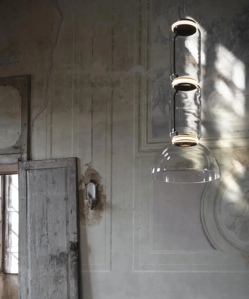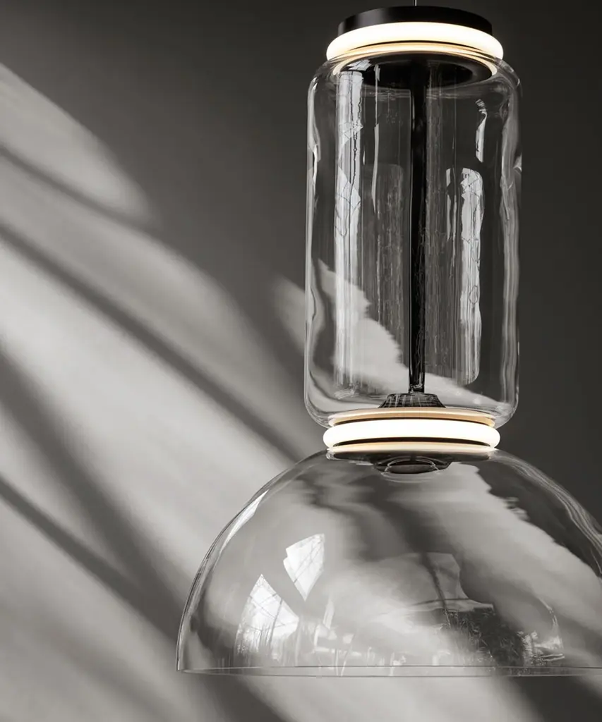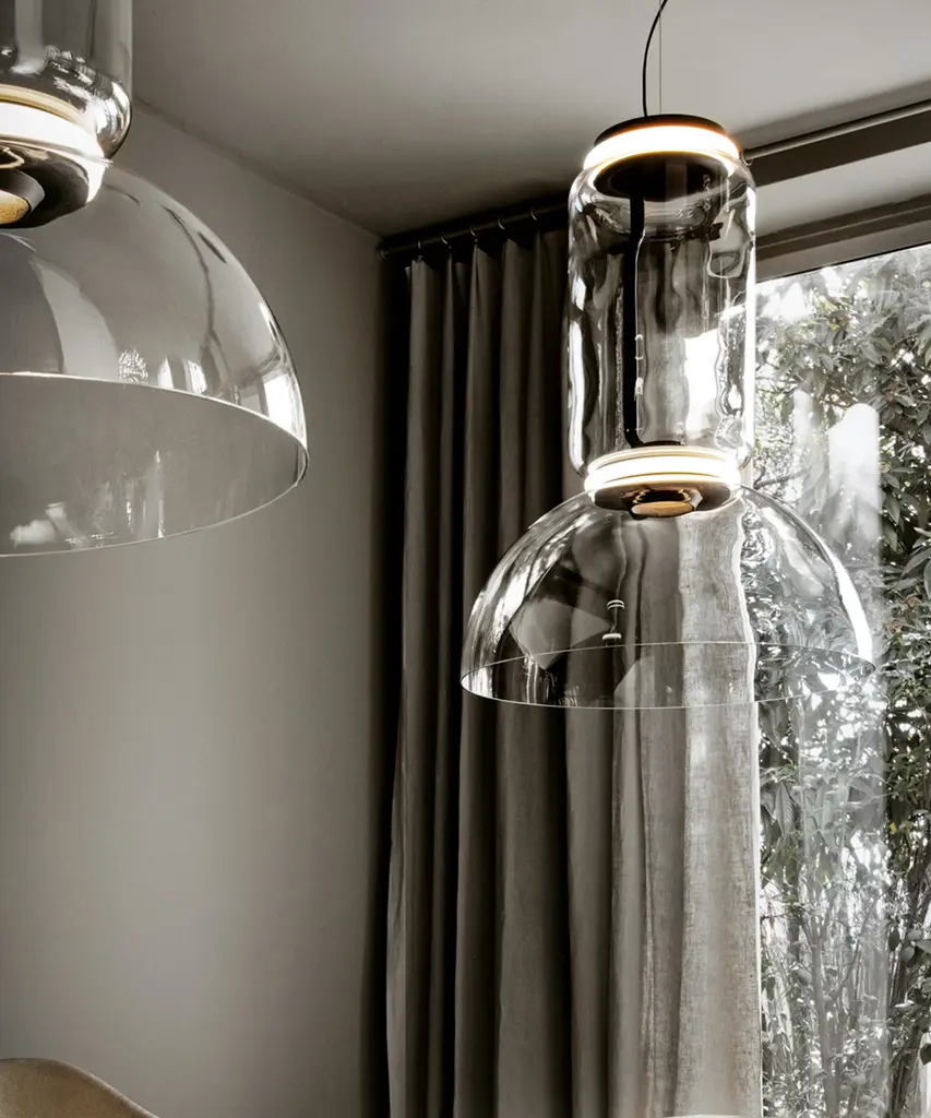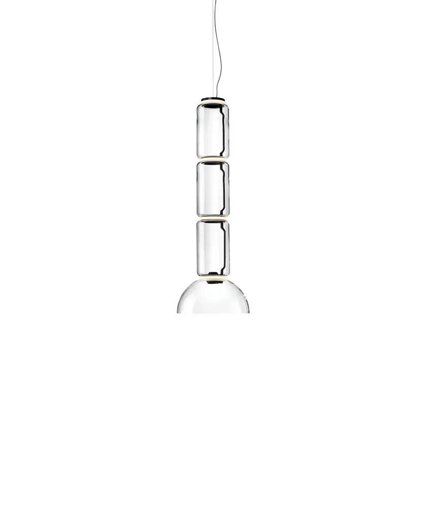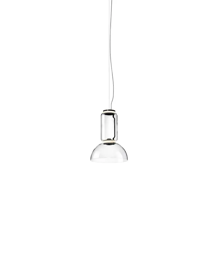 Noctambule LED dimmable pendant light with bowl shade, created by renowned designer Konstantin Grcic for FLOS, is an innovative lighting system that comes in an array of artful designs. A transparent hand-blown glass cylinder, surrounded on both top and bottom by discrete LED technology, is the foundation of this product. The fixtures built from these units form columns of light at varying heights that illuminate at the intersection between each module. Configurable as a hanging or standing lamp, the Noctambule pendant lamp features additional components that allow for numerous options. The cylindrical body is available at a low and high heights, and a dome- or cone-shaped head can be selected if a more direct light source is desired. Dimming capabilities can be configured in the power supply unit within the ceiling rose or as a pedal panel on the power cord. The inspiration behind the design: Inspired by night owls, Noctambule features a transparent body that almost blends into a room when unlit, but makes its presence known when it illuminates at night. Discover the entire collection of this magical award-winning collection of cylindrical LED dimmable modern lights. This authentic design is produced in Italy exclusively by Flos.