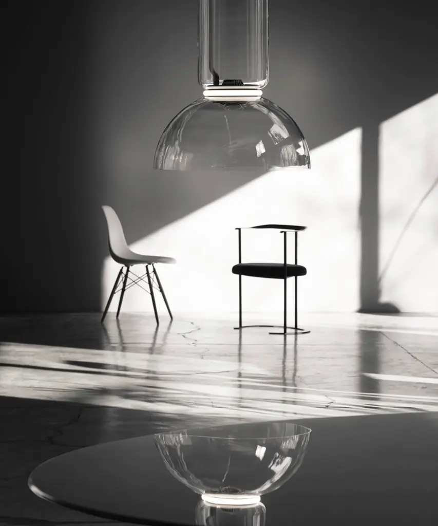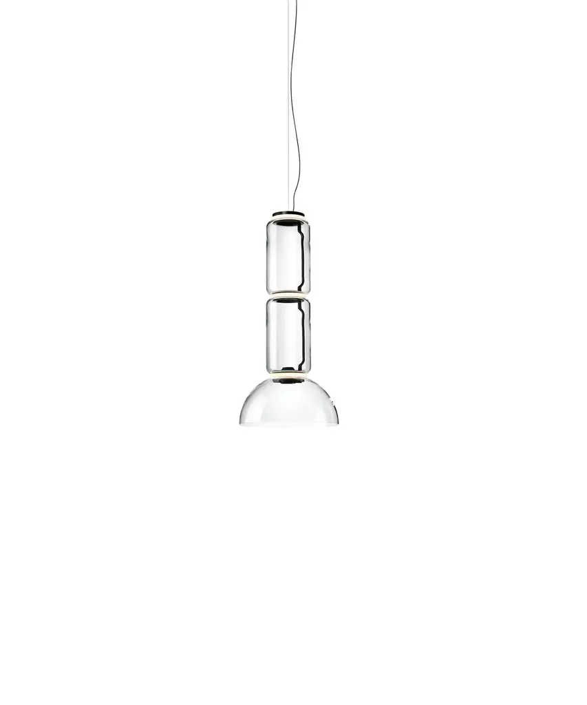 Noctambule LED dimmable pendant light with bowl shade, created by renowned designer Konstantin Grcic for FLOS, is an innovative lighting system that comes in an array of artful designs. A transparent hand-blown glass cylinder, surrounded on both top and bottom by discrete LED technology, is the foundation of this product. The fixtures built from these units form columns of light at varying heights that illuminate at the intersection between each module. Configurable as a hanging or standing lamp, the Noctambule pendant lamp features additional components that allow for numerous options. The cylindrical body is available at a low and high heights, and a dome- or cone-shaped head can be selected if a more direct light source is desired. Dimming capabilities can be configured in the power supply unit within the ceiling rose or as a pedal panel on the power cord. The inspiration behind the design: Inspired by night owls, Noctambule features a transparent body that almost blends into a room when unlit, but makes its presence known when it illuminates at night. Discover the entire collection of this magical award-winning collection of cylindrical LED dimmable modern lights. This authentic design is produced in Italy exclusively by Flos.