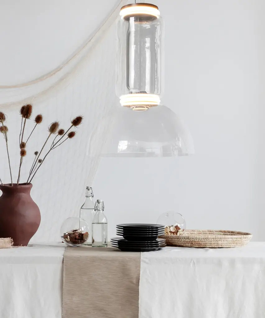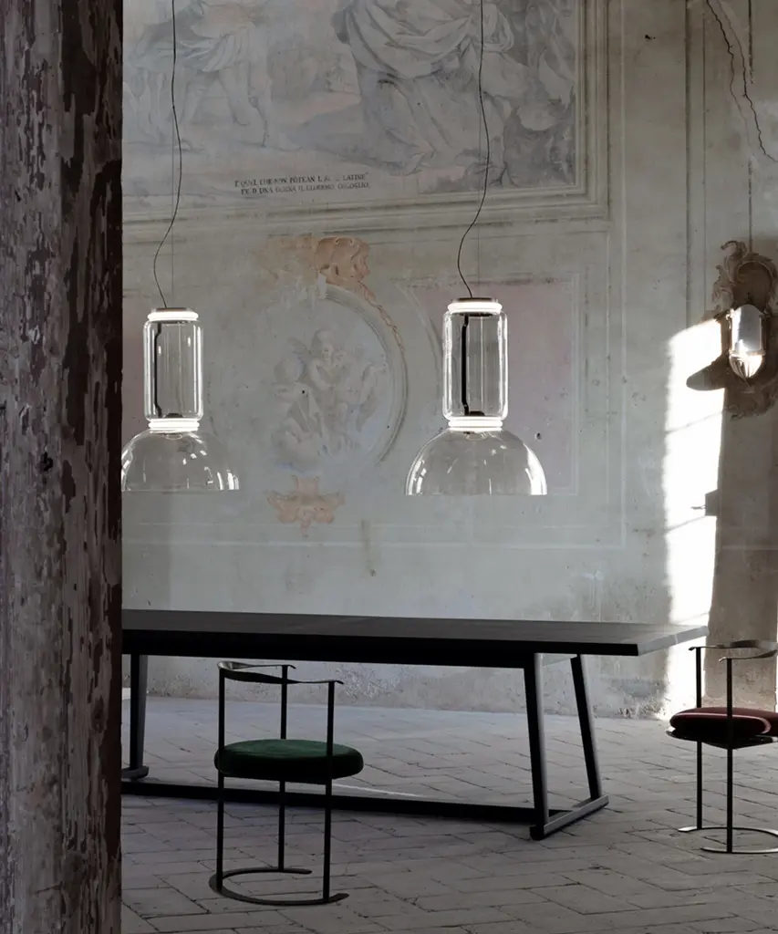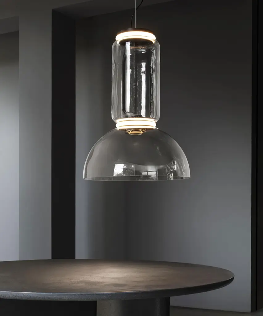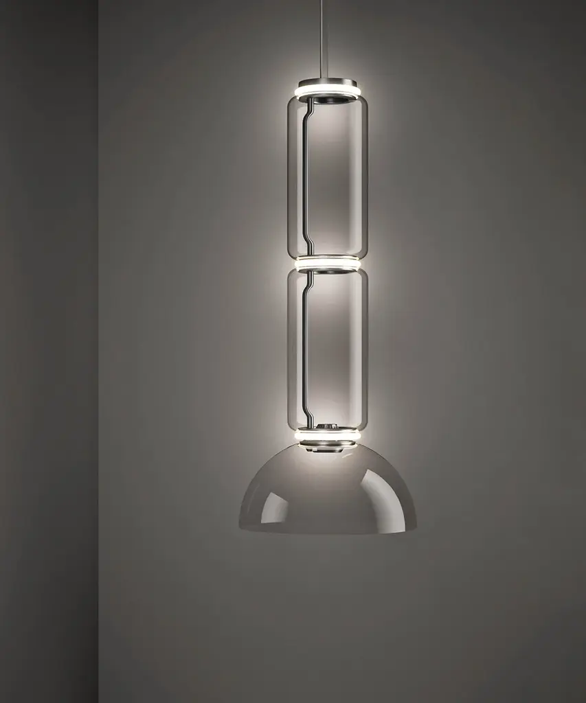 Noctambule LED dimmable pendant light with bowl shade, created by renowned designer Konstantin Grcic for FLOS, is an innovative lighting system that comes in an array of artful designs. A transparent hand-blown glass cylinder, surrounded on both top and bottom by discrete LED technology, is the foundation of this product. The fixtures built from these units form columns of light at varying heights that illuminate at the intersection between each module. Configurable as a hanging or standing lamp, the Noctambule pendant lamp features additional components that allow for numerous options. The cylindrical body is available at a low and high heights, and a dome- or cone-shaped head can be selected if a more direct light source is desired. Dimming capabilities can be configured in the power supply unit within the ceiling rose or as a pedal panel on the power cord. The inspiration behind the design: Inspired by night owls, Noctambule features a transparent body that almost blends into a room when unlit, but makes its presence known when it illuminates at night. Discover the entire collection of this magical award-winning collection of cylindrical LED dimmable modern lights. This authentic design is produced in Italy exclusively by Flos.