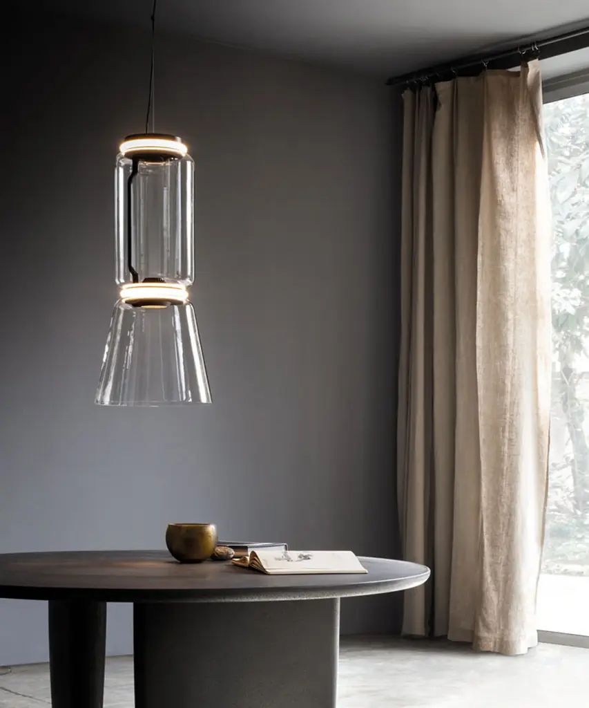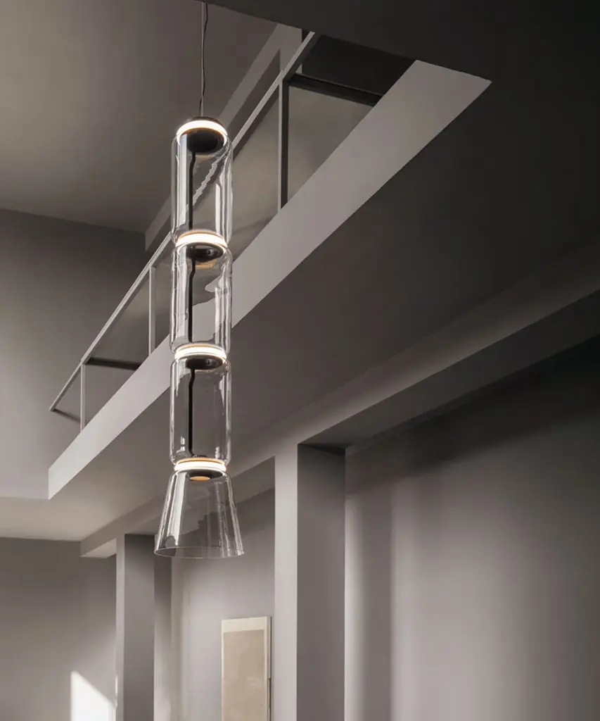 Crafted by Konstantin Grcic, FLOS Noctambule is a new lighting system that is available in a wide variety of designs. The foundation of this lighting product is a hand-blown transparent glass cylinder that is powered by LED technology at the top and bottom. Its multiple units come together to create light columns at different heights, which in turn illuminate the intersection between each unit or module. This modern pendant light with cone diffuser by FLOS also features complementing components that can be experimented with to configure the fixture as a pendant lamp or standing lamp. The user can combine the product's cylindrical body (available at a low and high height) with a cone- or dome-shaped head which provides direct lighting. The user can control Noctambule's dimming capabilities in the power unit within the ceiling rose or as a pedal-operated panel in the power cord. Inspired by night owls, Noctambule by Konstantin Grcic features a transparent body that almost blends into a room when unlit but makes its presence known when it illuminates at night. This authentic design is produced in Italy exclusively by Flos.
