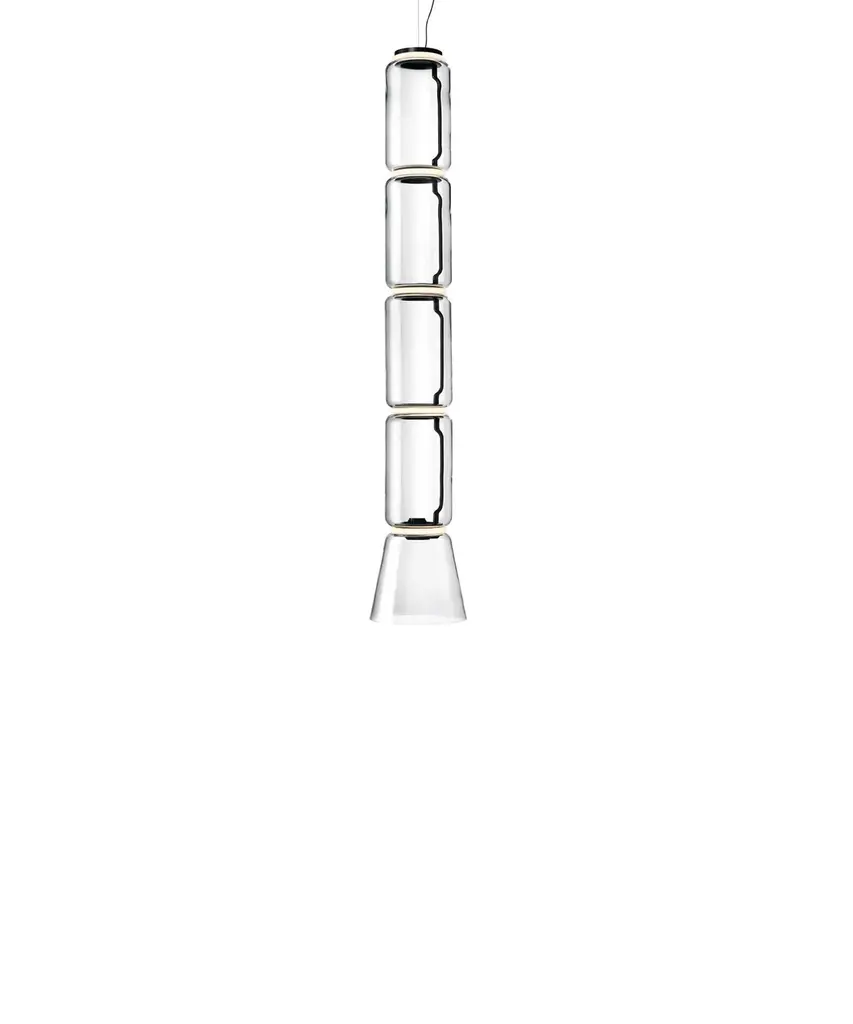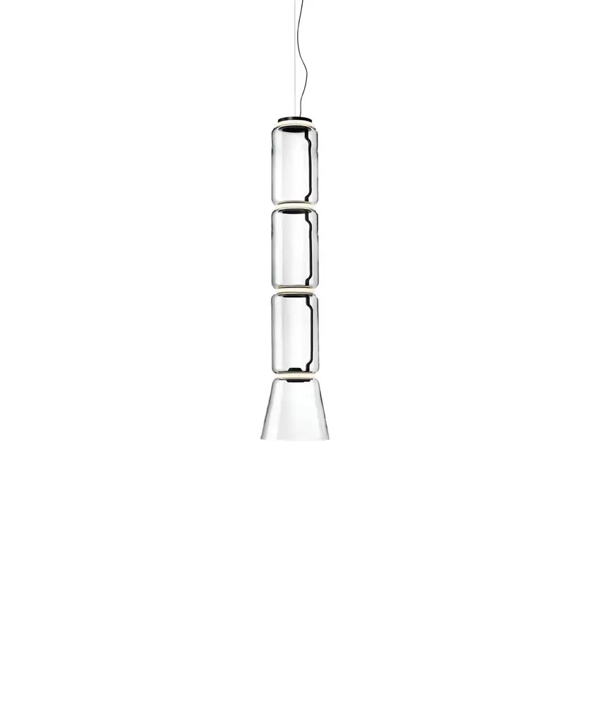 Crafted by Konstantin Grcic, FLOS Noctambule is a new lighting system that is available in a wide variety of designs. The foundation of this lighting product is a hand-blown transparent glass cylinder that is powered by LED technology at the top and bottom. Its multiple units come together to create light columns at different heights, which in turn illuminate the intersection between each unit or module. This modern pendant light with cone diffuser by FLOS also features complementing components that can be experimented with to configure the fixture as a pendant lamp or standing lamp. The user can combine the product's cylindrical body (available at a low and high height) with a cone- or dome-shaped head which provides direct lighting. The user can control Noctambule's dimming capabilities in the power unit within the ceiling rose or as a pedal-operated panel in the power cord. Inspired by night owls, Noctambule by Konstantin Grcic features a transparent body that almost blends into a room when unlit but makes its presence known when it illuminates at night. This authentic design is produced in Italy exclusively by Flos.