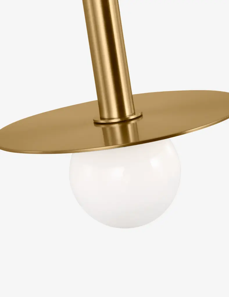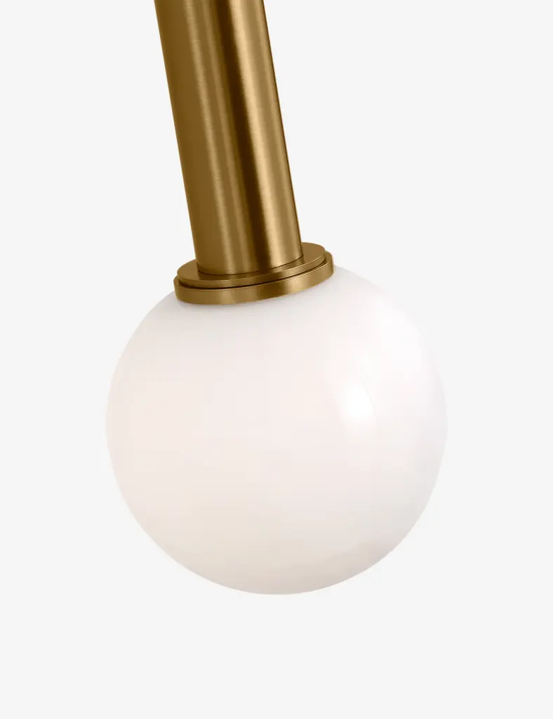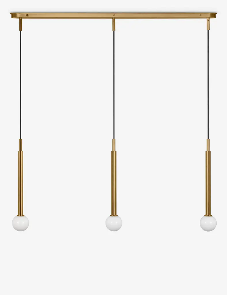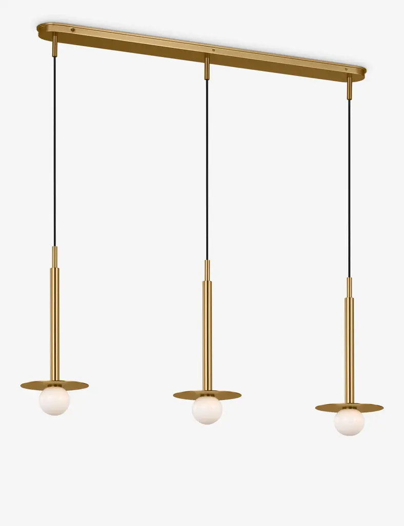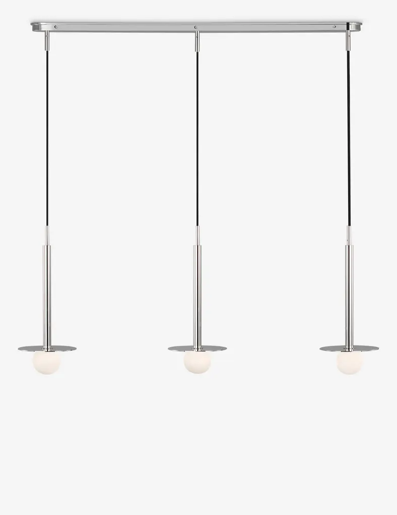 Kelly Wearstler possesses an intuitive eye for finding harmony through contrast, creating richly layered spaces and thoroughly refined elements for the home. The renowned designer brings her evocative style to lighting with the Nodes linear pendant. This sleek hanging light strikes statement appeal overhead with milk glass globes and removable disk canopies.