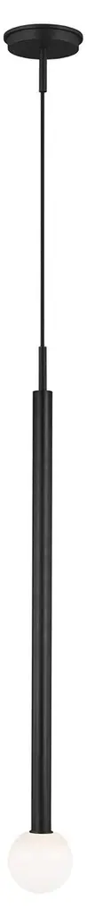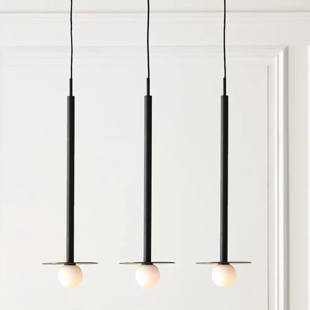 This pendant fixture is a dazzling study of contrasts: straight lines and graceful circles, opalescent mouth-blown milk glass and steel given a rich black finish.
