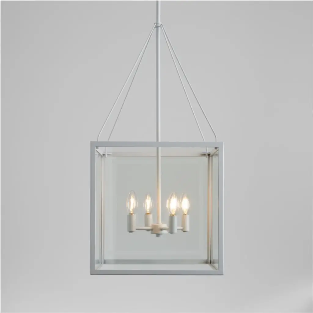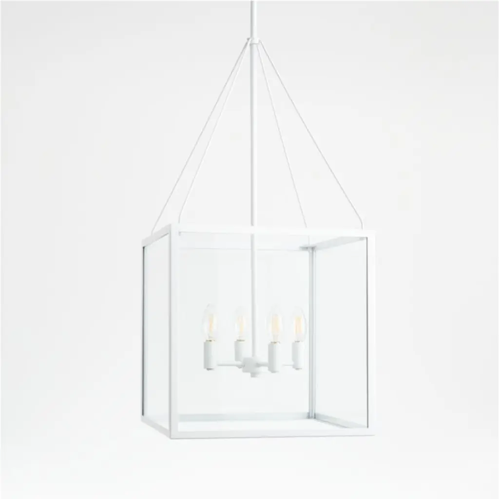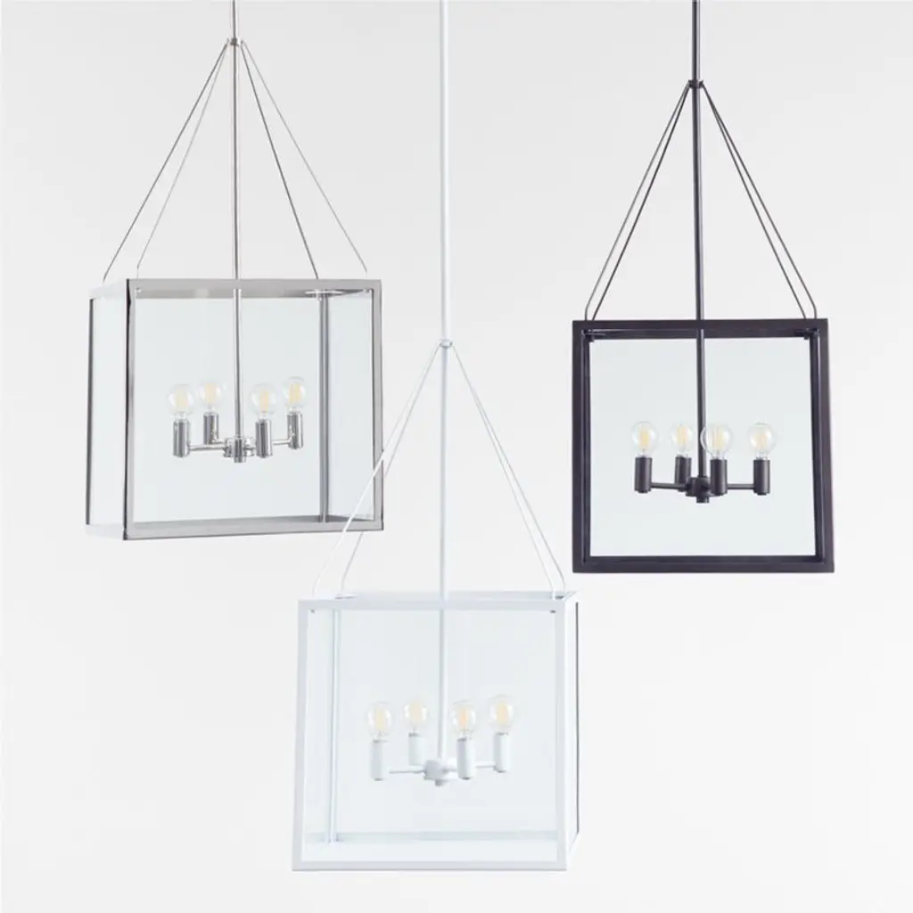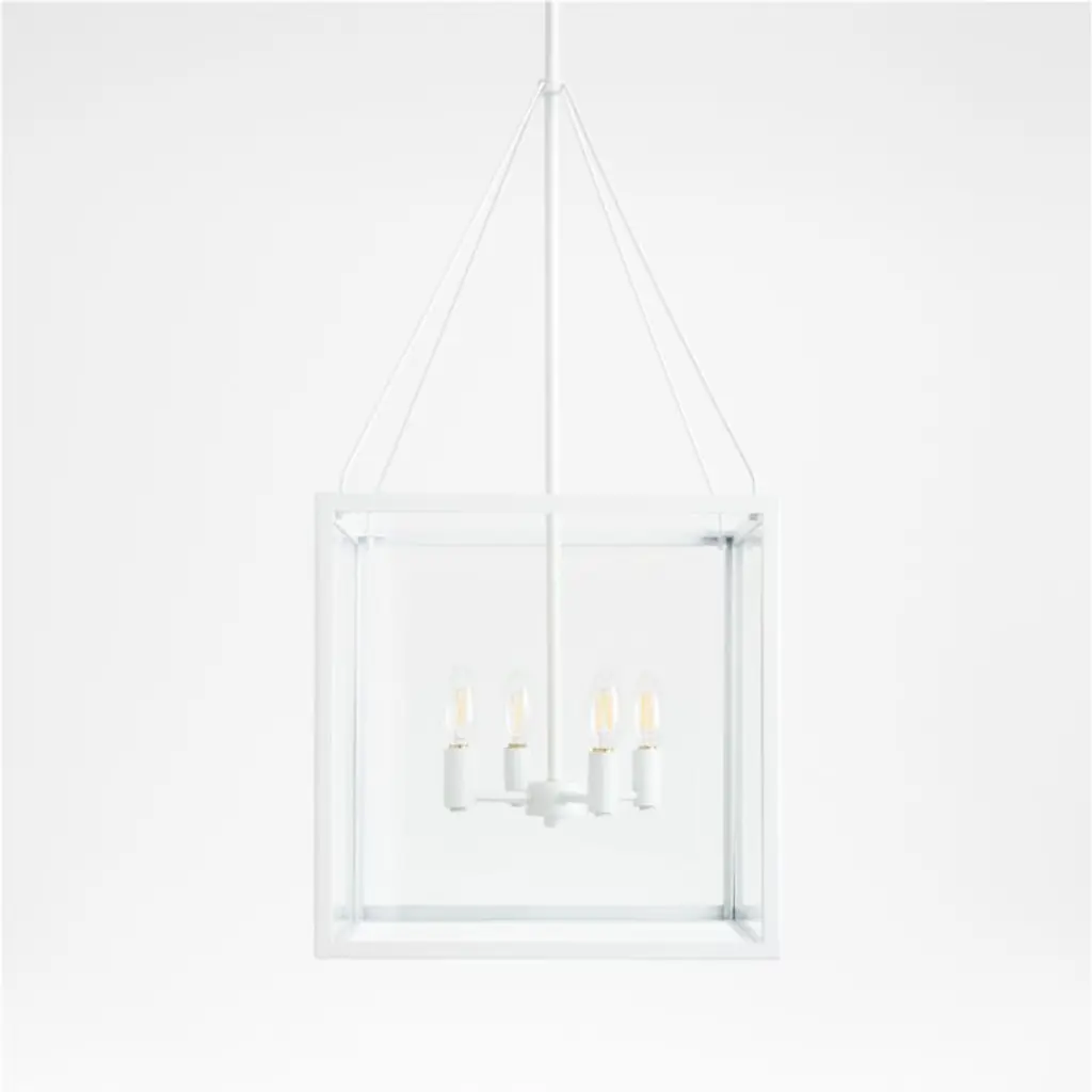 Paned in clear glass, our Nolan pendant frames a four-bulb chandelier in bright white. The crisp cube pairs with the rounded sockets and downrod for a ceiling light at once modern and traditional. Hang a single pendant over a breakfast nook, or line up multiples over a kitchen island or down a hallway. Our Nolan square white glass pendant light is a Crate & Barrel exclusive.