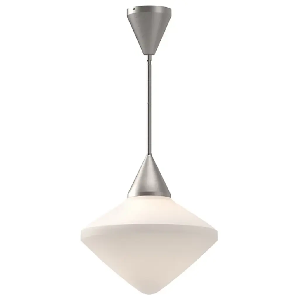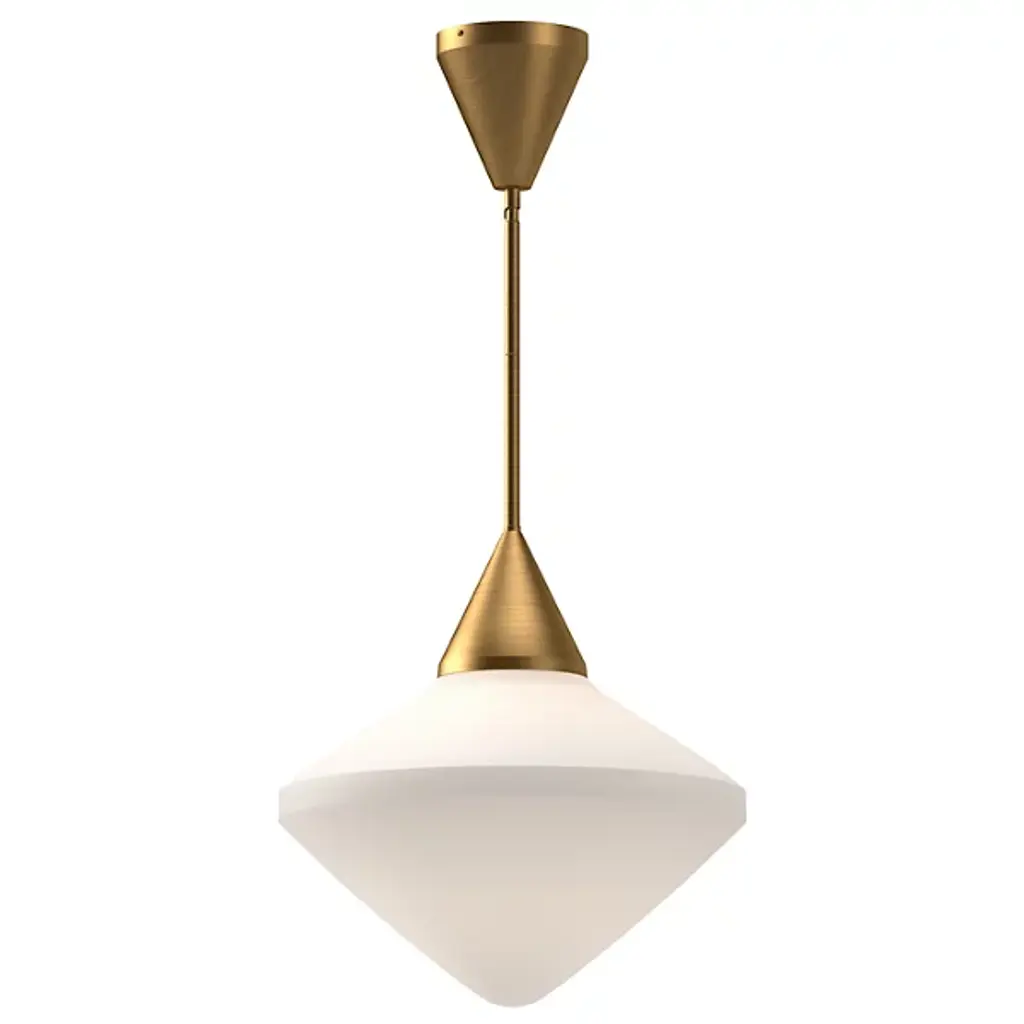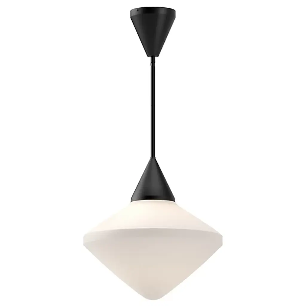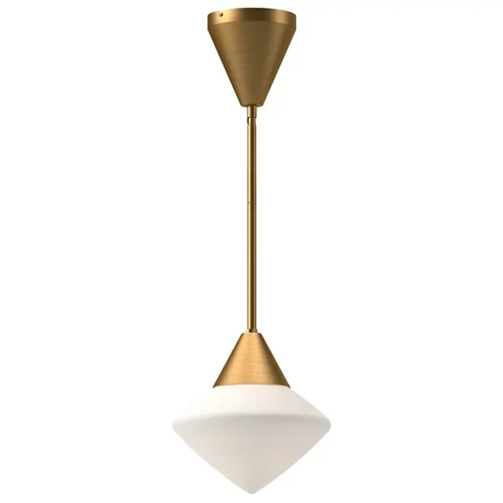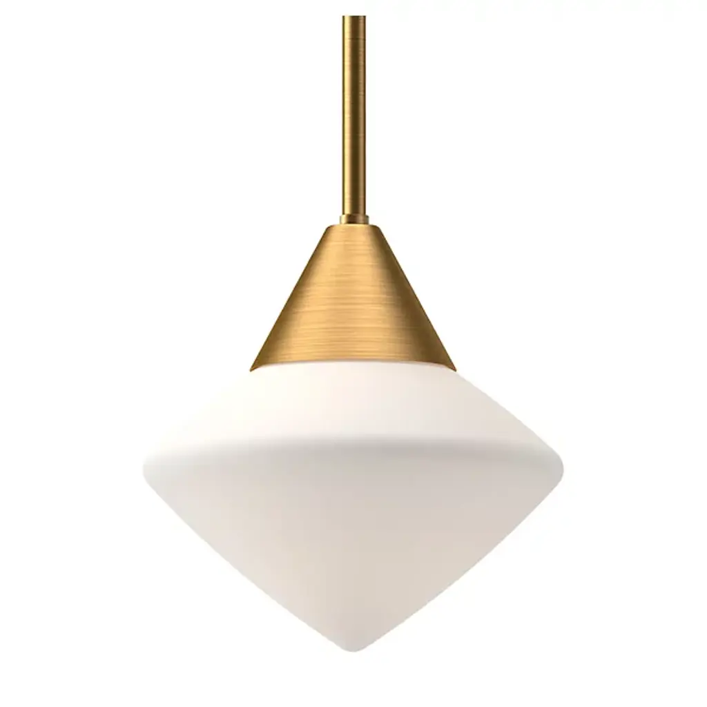 Seducing like the radiant, pointy form of a hand-cut diamond. The Nora Pendant from Alora Mood adds an elegant focus to the modern setting. It follows the mid-century visual language of pairing striking shapes with elegant colorways. Perfect over a dining table or kitchen island, the piece hangs with a slim down rod that looks great in a series. Held with a sleek metal cone, the glass shade shares the angular silhouette of the diamond while setting itself apart with a mellowing opaque surface. A soft, glare-free light filters through the shade, introducing an ambient down glow into the room.