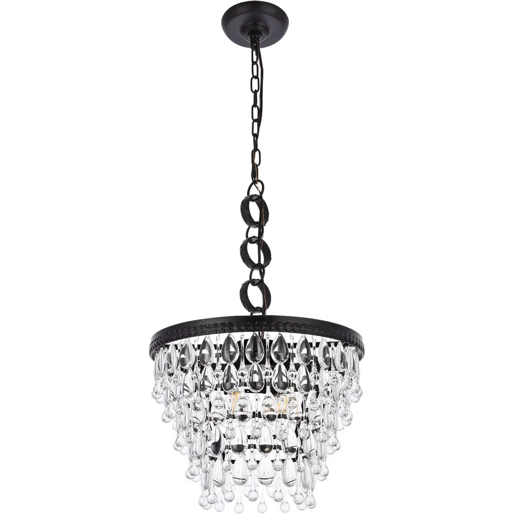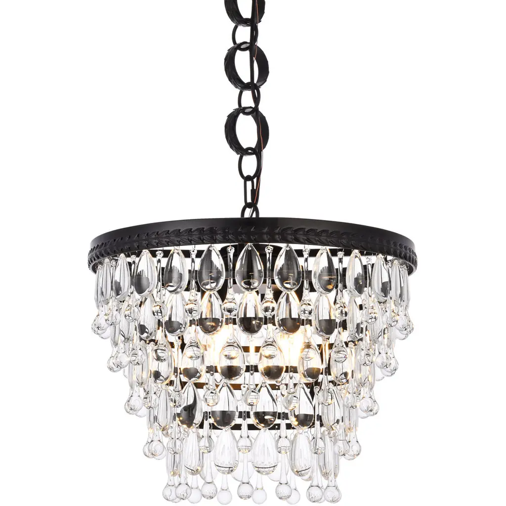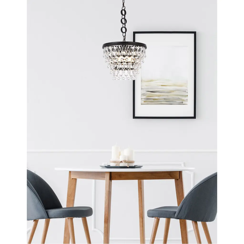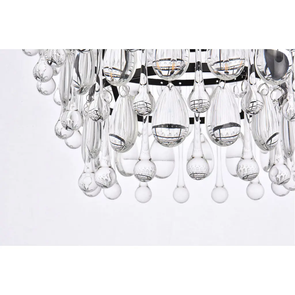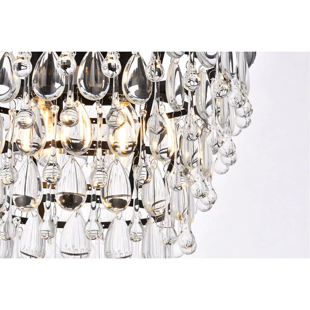 Like the sun setting on a frozen lake, this collection shimmers with tiers of icy crystals reflecting the soft glow of the candelabras. True to its Nordic namesake, the cascades of royal-cut clear crystals complement the etched black finished frame. Suspended by an elegantly looped chain that draws the eye to the cool sheen below.