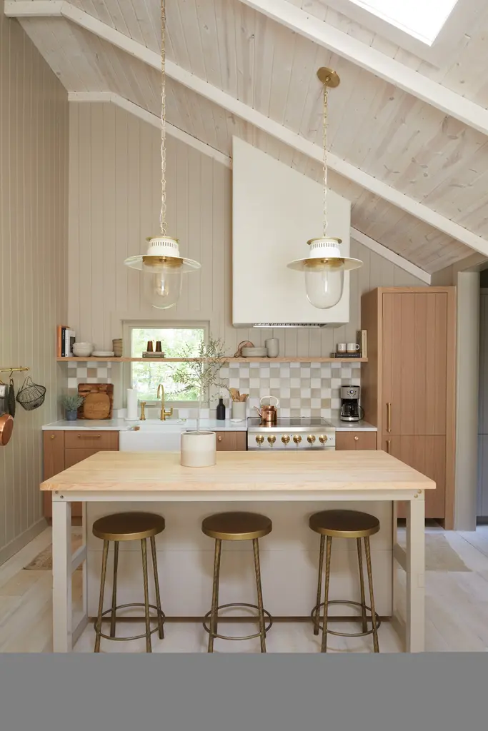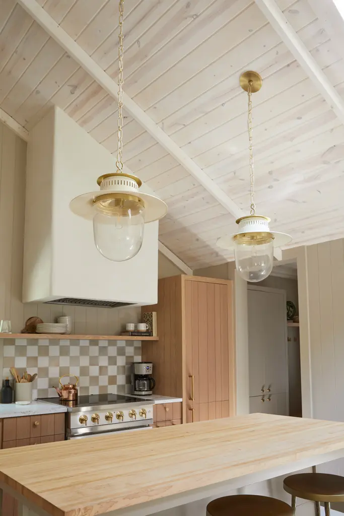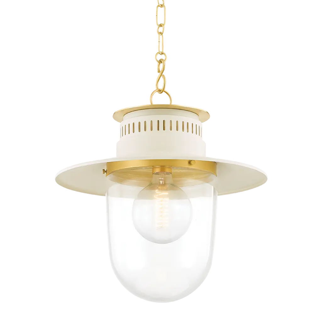 Tastefully revived for the modern home, the Nori Pendant blends vintage appeal with contemporary details beautifully. An intricate aged brass link chain holds a lantern-style frame, featuring sleek perforations at the base. The wide brim shade leads to more brass detailing and a clear glass dome. Also available in a smaller size.