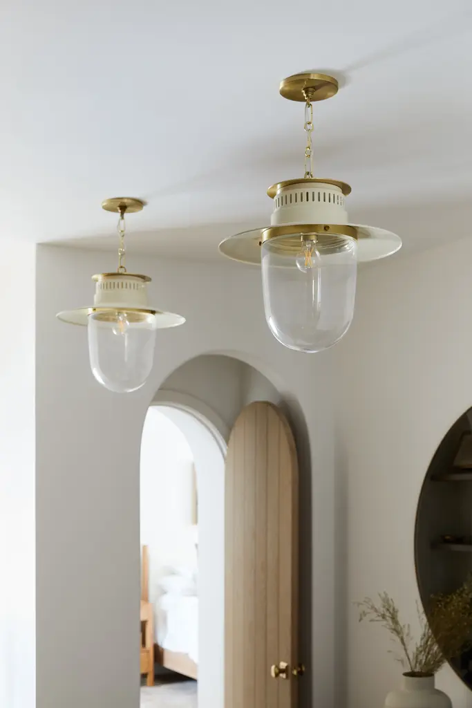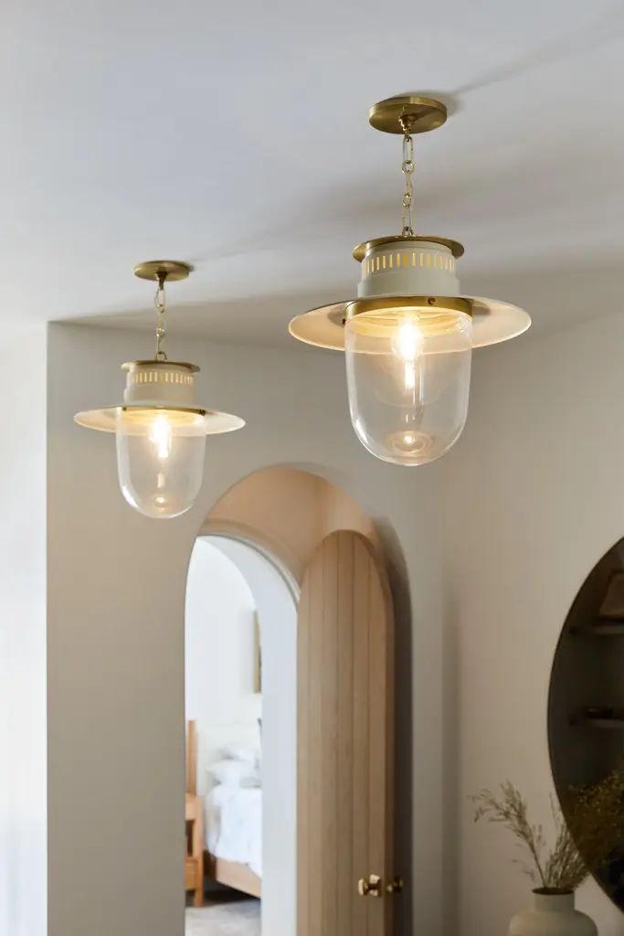 Tastefully revived for the modern home, the Nori Pendant blends vintage appeal with contemporary details beautifully. An intricate aged brass link chain holds a lantern-style frame, featuring sleek perforations at the base. The wide brim shade leads to more brass detailing and a clear glass dome. Also available in a smaller size.