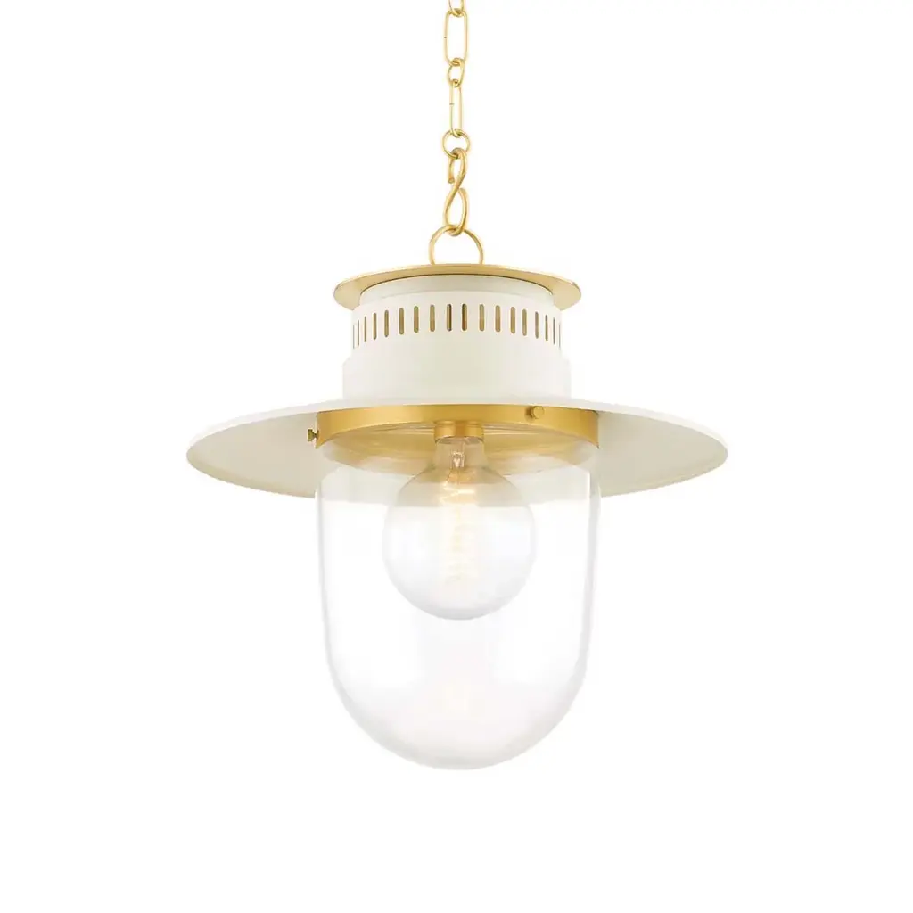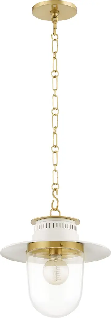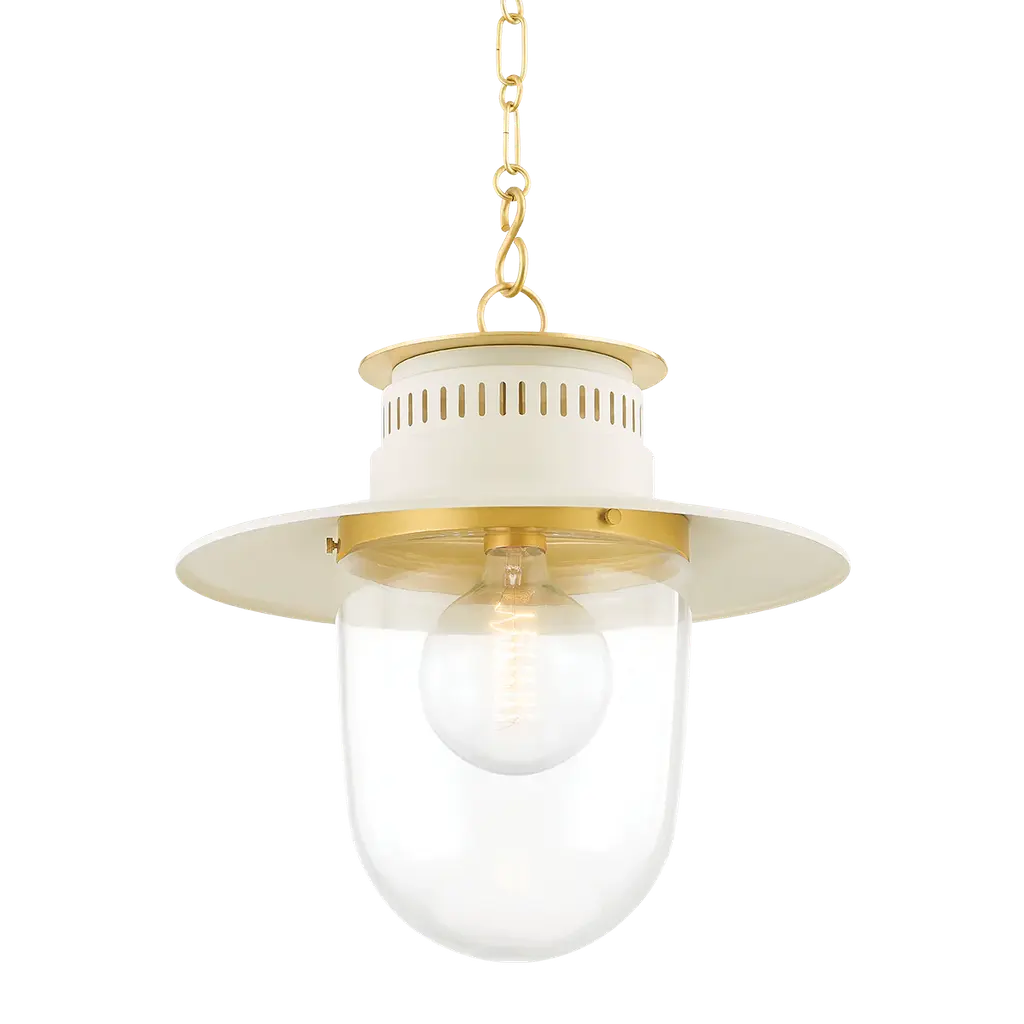 Tastefully revived for the modern home, the Nori Pendant Light blends vintage appeal with contemporary details beautifully. An intricate aged brass link chain holds a lantern-style frame, featuring sleek perforations at the base. The wide brim shade leads to more brass detailing and a clear glass dome. Features