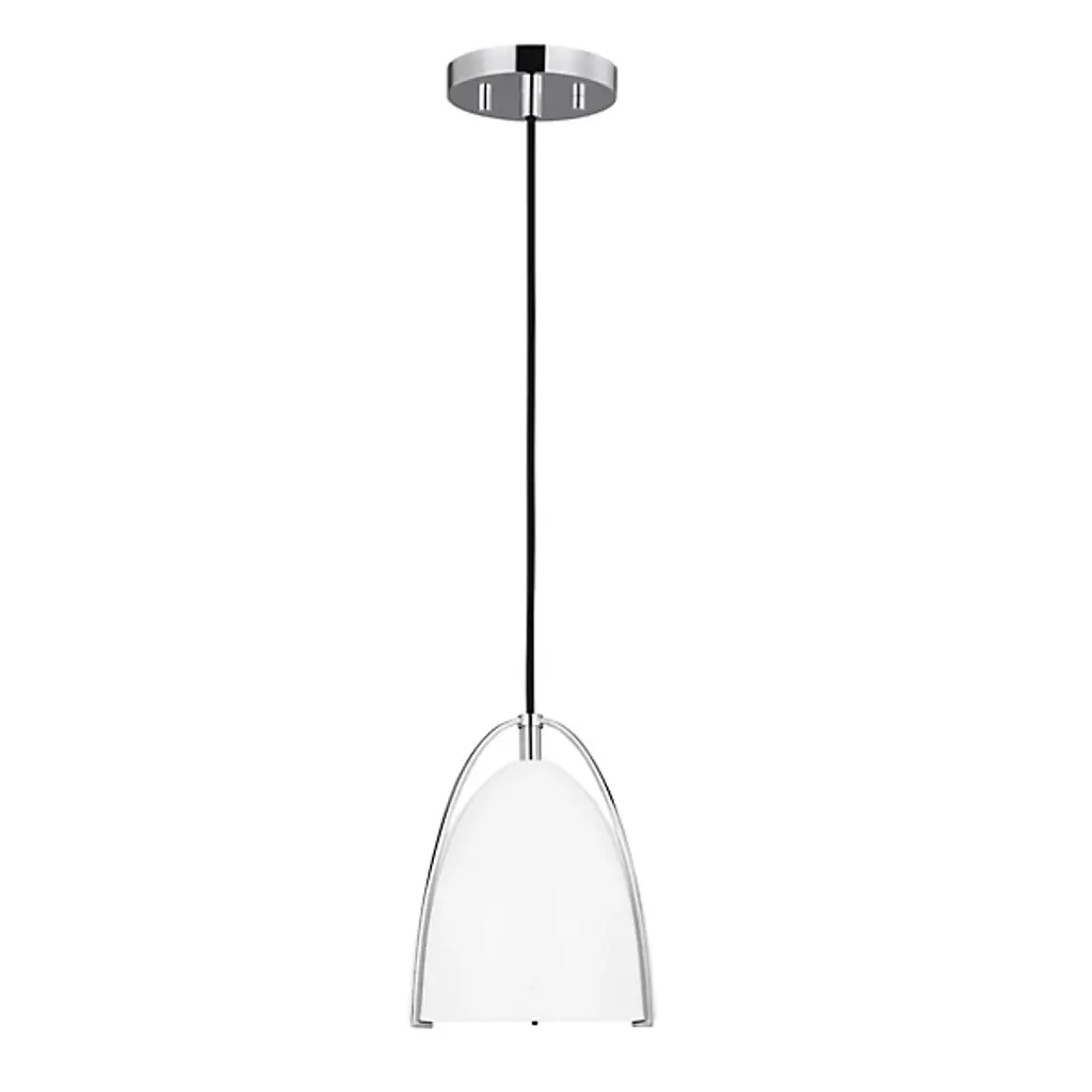 A sleek and bold modern piece, the Norman Mini Pendant from Visual Comfort Studio, formerly known as Sea Gull Lighting, presents a bright layer of light to the space immediately below. A long and thin cord drapes from the ceiling and leads to an angled shade accented by thin, shining metal arms. The single bulb that rests within the shade fills it with warm light that spills effortlessly down below, marking the area with a welcoming and everlasting presence.