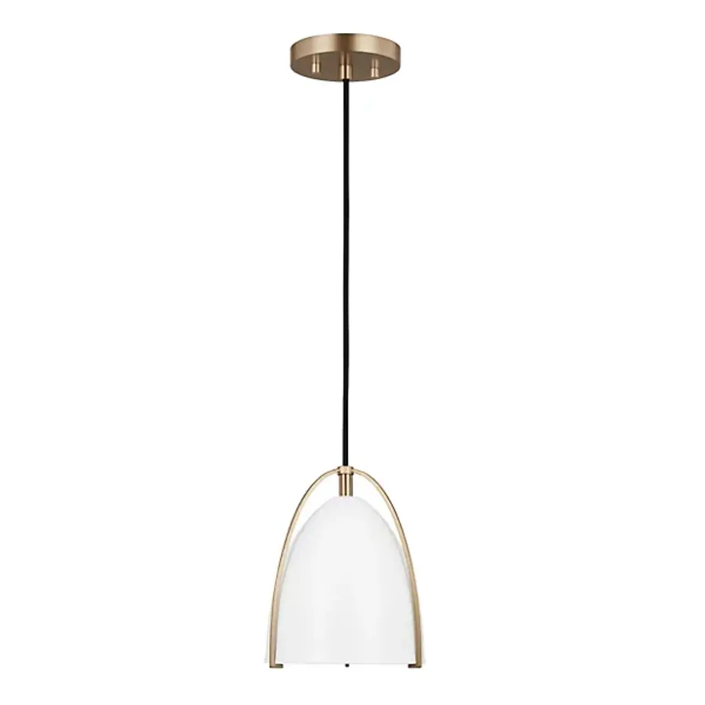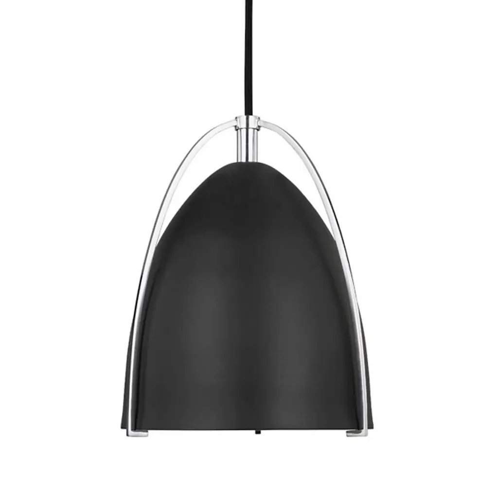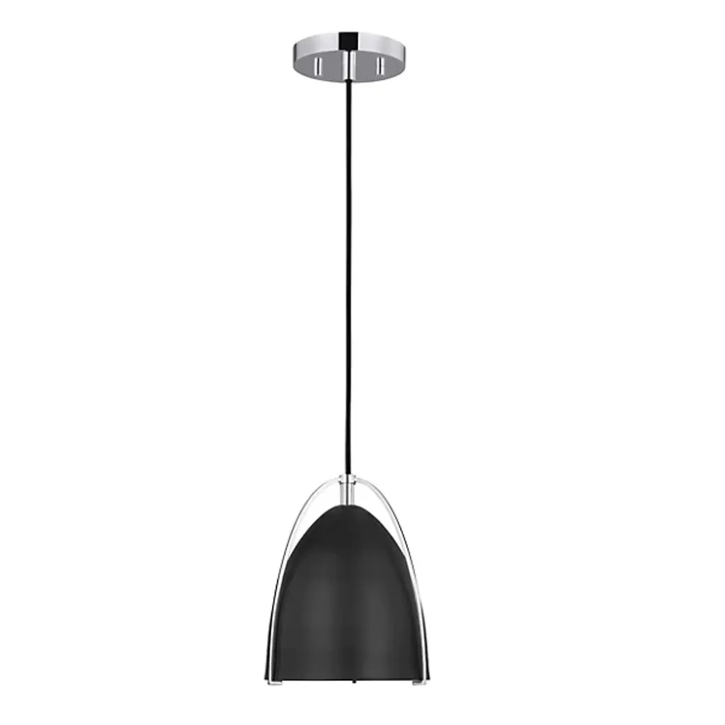 A sleek and bold modern piece, the Norman Mini Pendant from Visual Comfort Studio, formerly known as Sea Gull Lighting, presents a bright layer of light to the space immediately below. A long and thin cord drapes from the ceiling and leads to an angled shade accented by thin, shining metal arms. The single bulb that rests within the shade fills it with warm light that spills effortlessly down below, marking the area with a welcoming and everlasting presence.