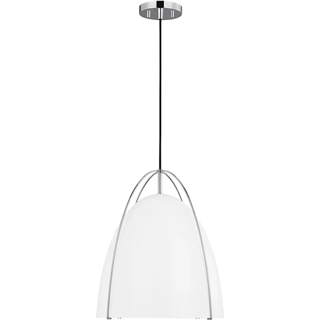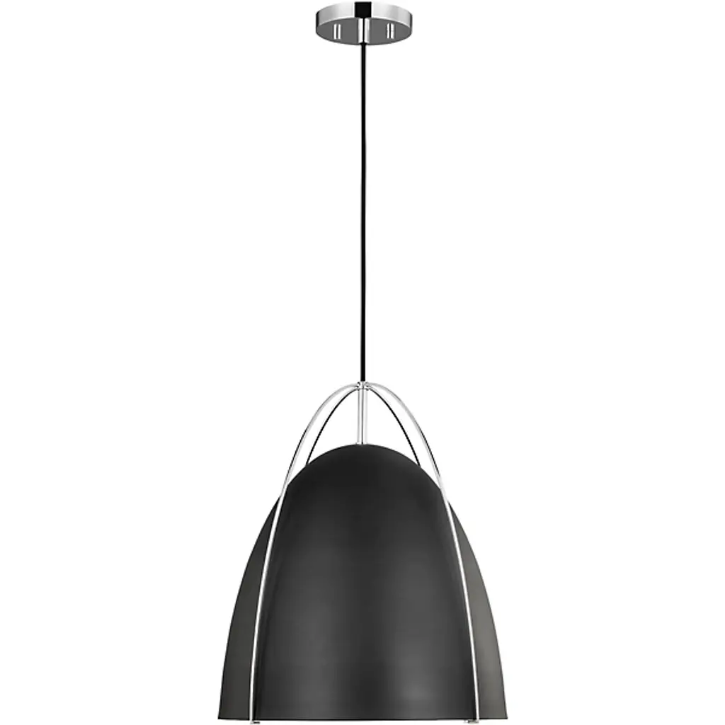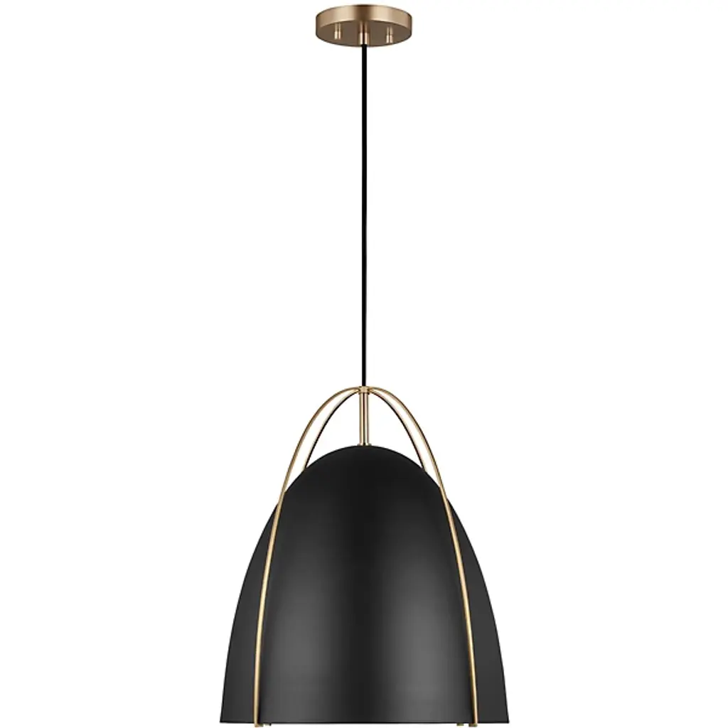 Lend any of your indoor spaces an elegant accompaniment with the Norman Pendant from Visual Comfort Studio, formerly known as Sea Gull Lighting, A sleek mix of modern style and contemporary practicality, it is anchored to the ceiling by a small disc canopy that dispatches a sleek support down to a single socket below. The wet-listed lamping is screened from the sides by a metal goblet shade retained from above by four smooth steel branches that contrast with its matte surface, casting a focused pool of light below.