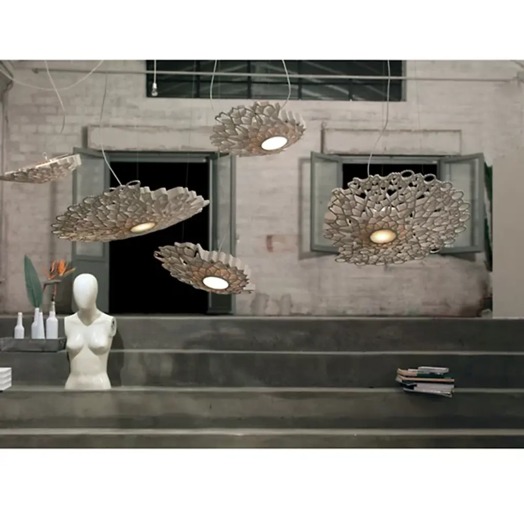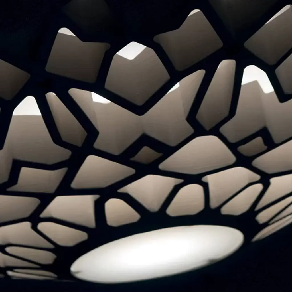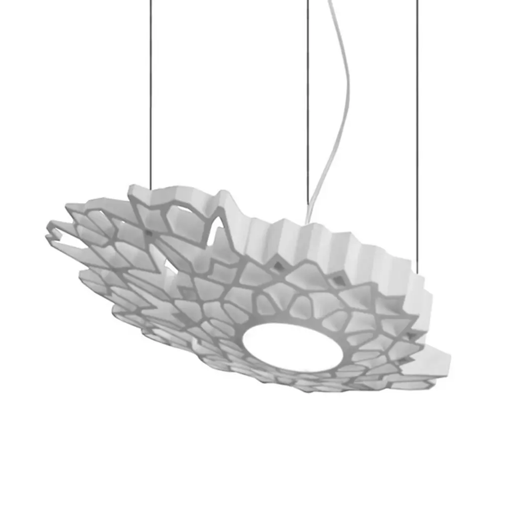 The Notredame LED Pendant by Karman was designed by duo Luca De Bona and Dario De Meo, who met while on the road between Milan and the Italian Veneto region. Collaborating, this architect and designer draw inspiration from that trip, and this piece recalls the appeal of natural light that can be found spreading through the rose windows of Gothic cathedrals. A poetic mix of the past and present, this three-dimensional piece adds an elegant look and landscape to the spaces it brightens as its design expands away from a central light source.