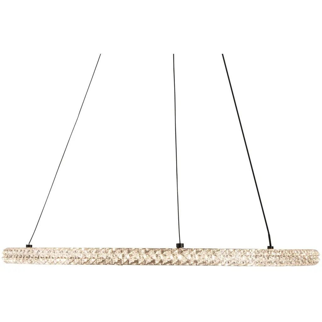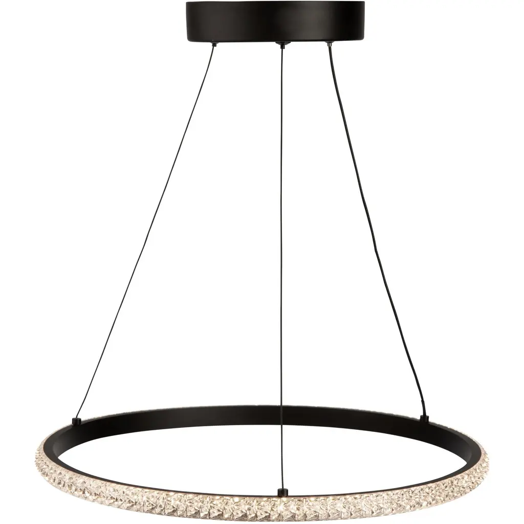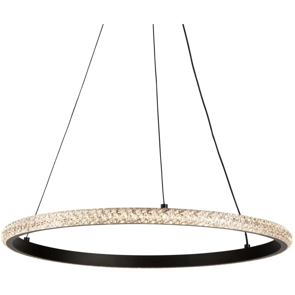 The Nova collection simply looks like jewelry suspended on thin cables. Illuminated by bright energy efficient LEDs the crystalline components sparkle from every angle. The frame, canopy, and wiring are black (These models are dimmable with appropriate LED rated dimmer switches).