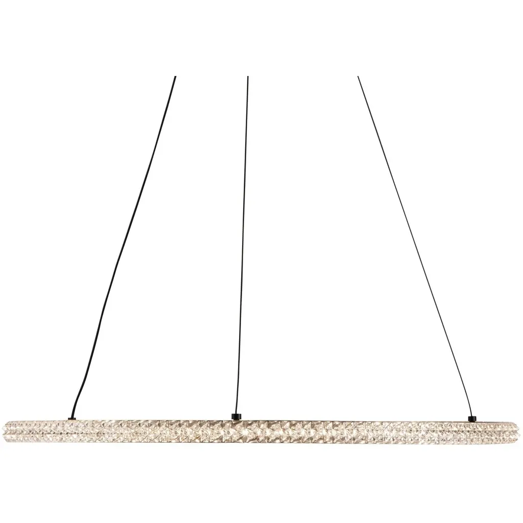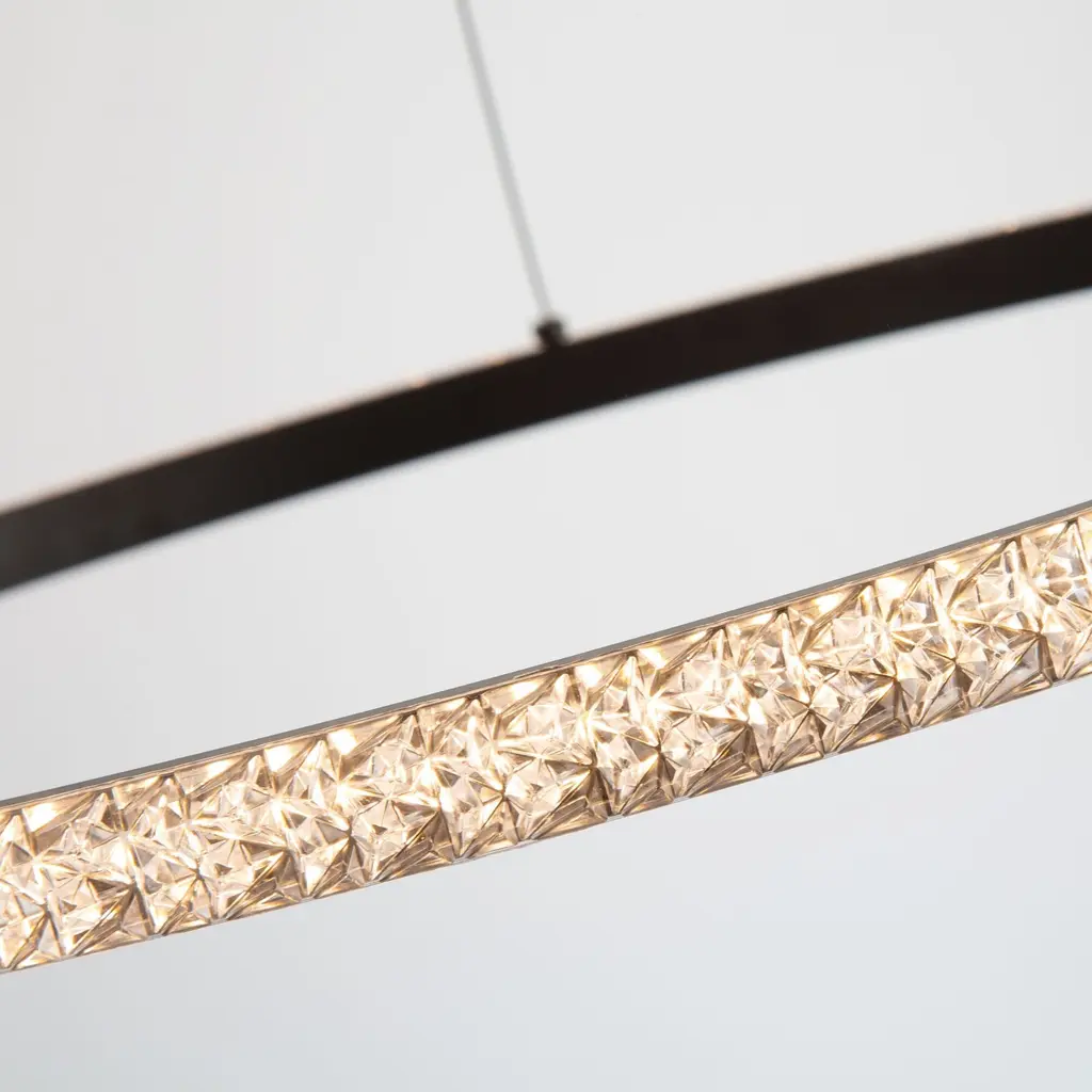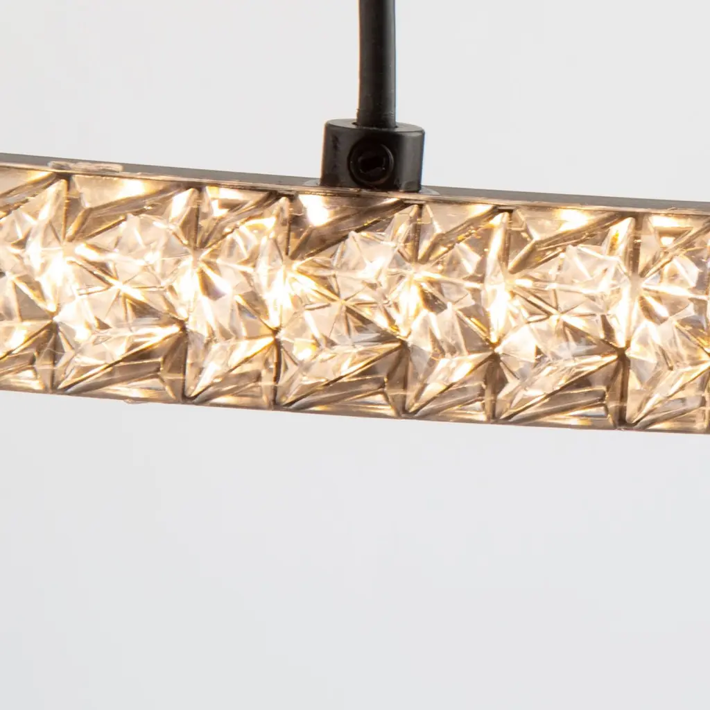 The Nova collection simply looks like jewelry suspended on thin cables. Illuminated by bright energy efficient LEDs the crystalline components sparkle from every angle. The frame, canopy, and wiring are black (These models are dimmable with appropriate LED rated dimmer switches).