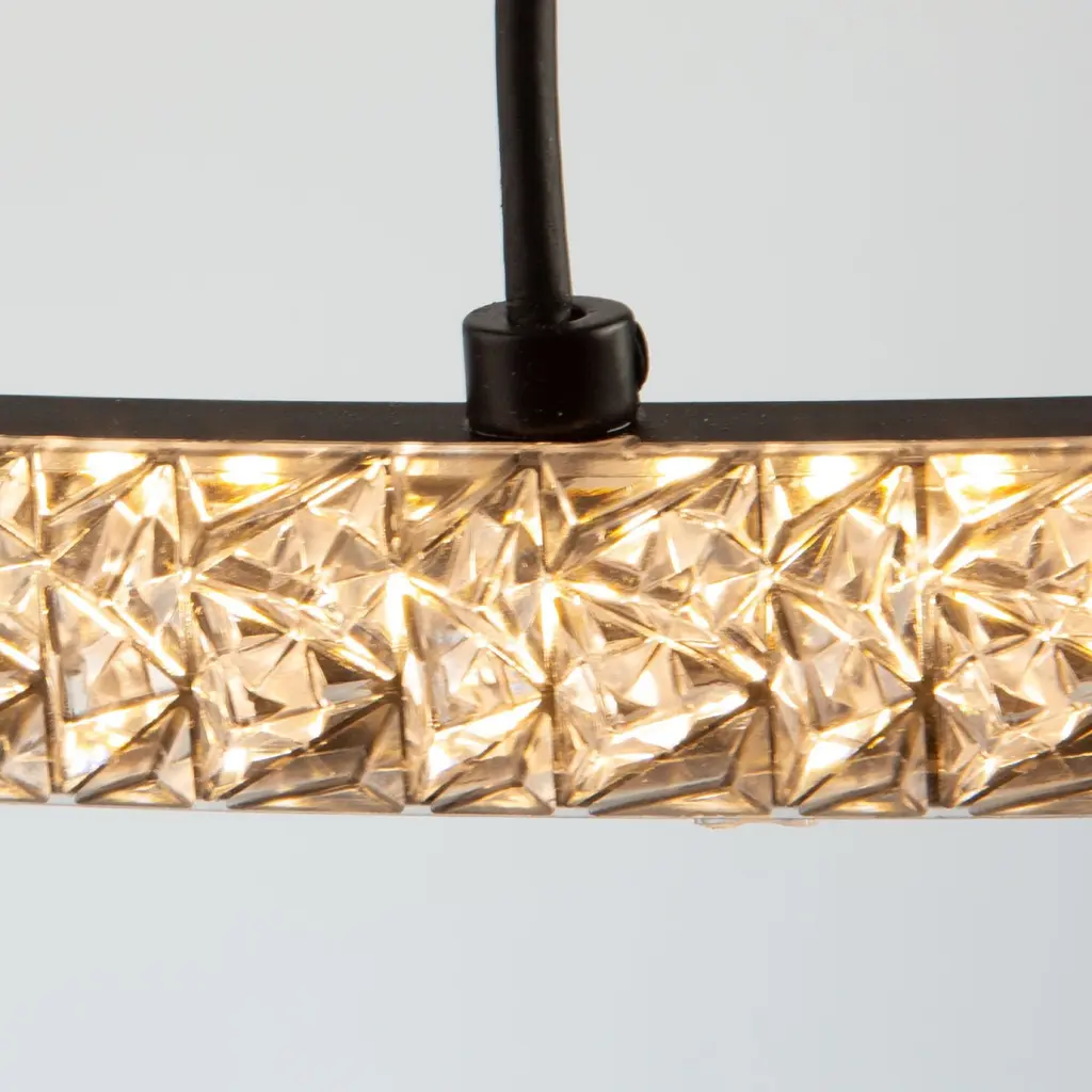 The Nova collection simply looks like jewelry suspended on thin cables. Illuminated by bright energy efficient LEDs the crystalline components sparkle from every angle. The frame, canopy, and wiring is black. (These models are dimmable with appropriate LED rated dimmer switches)