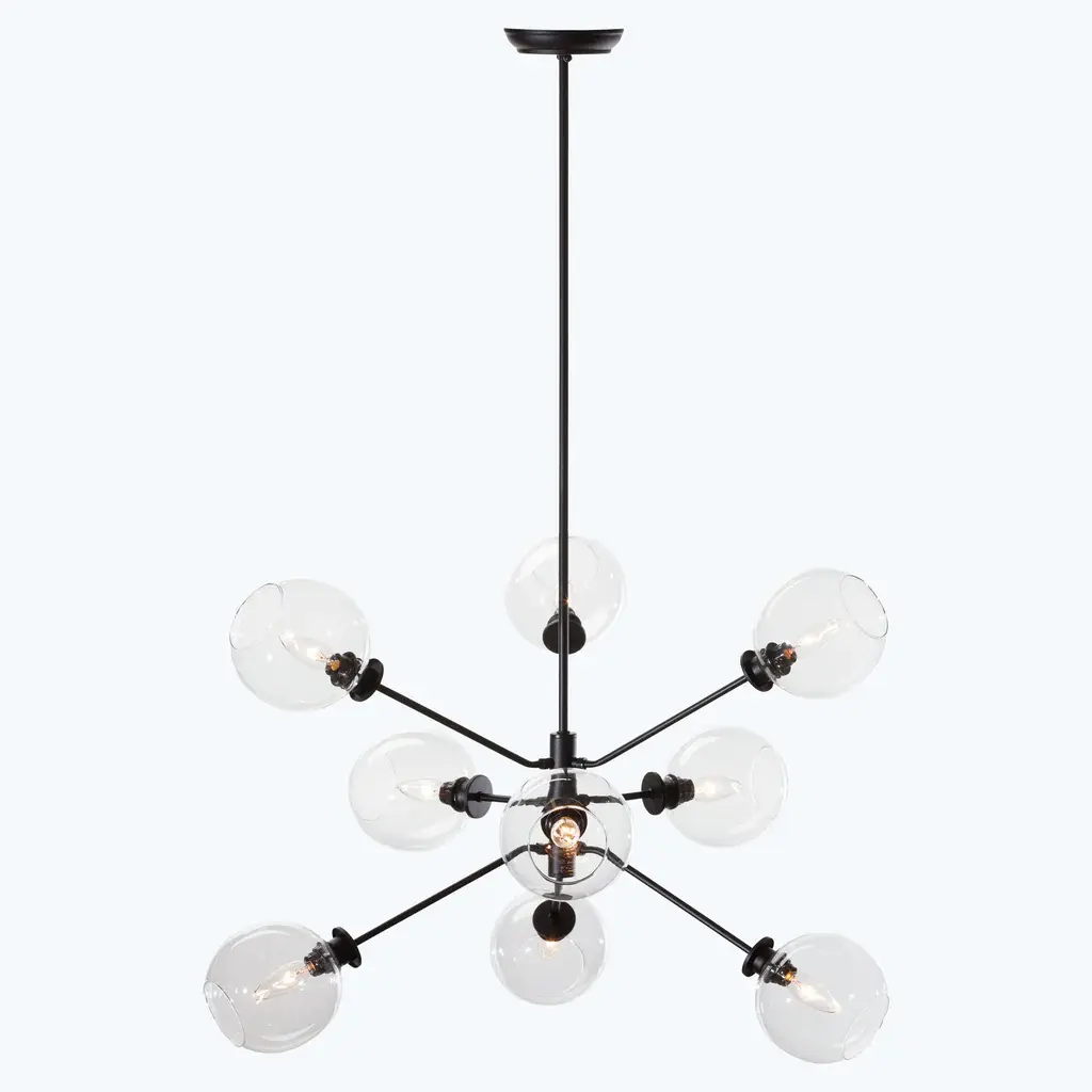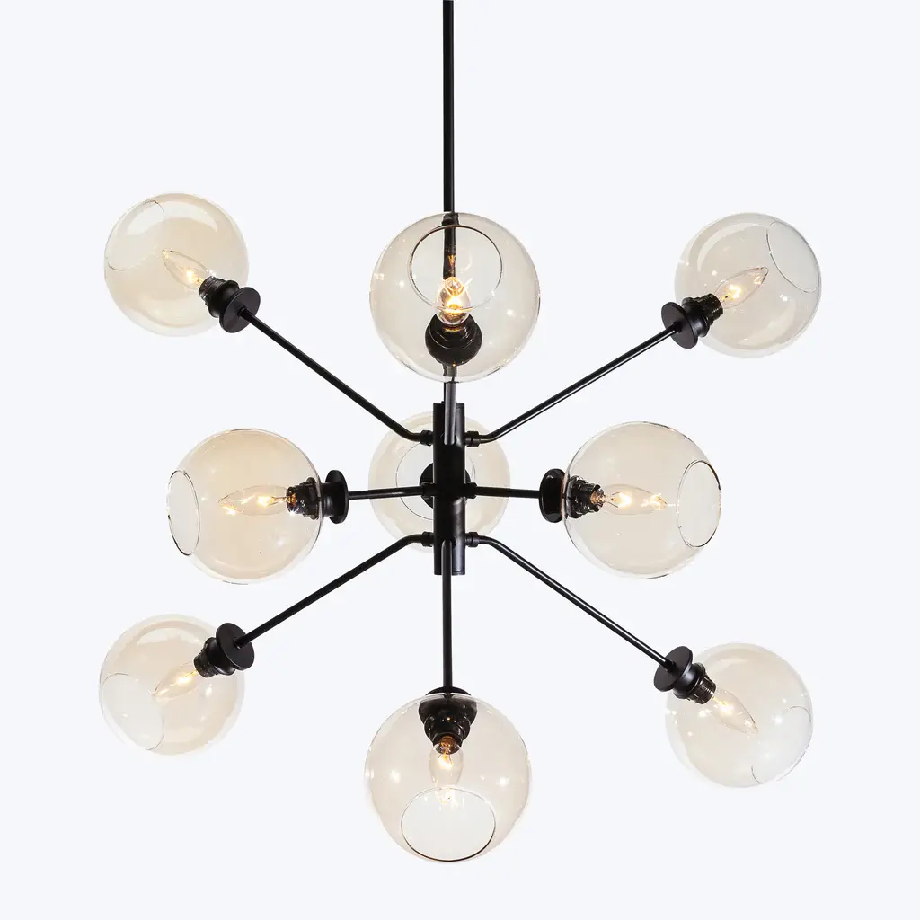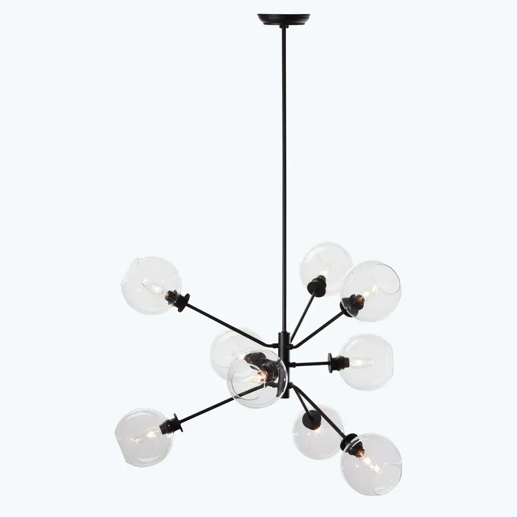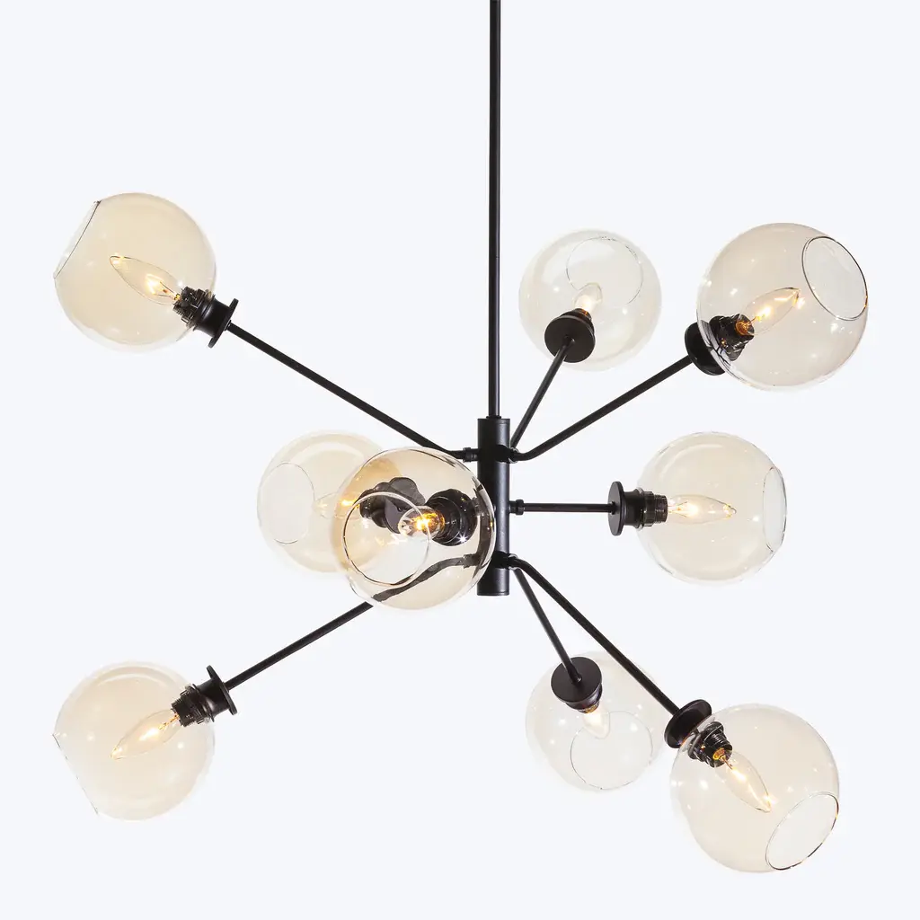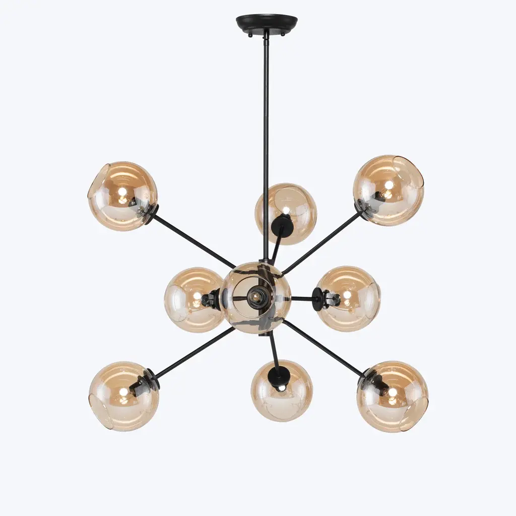 The Atom 9-Light Glass Pendant Fixture projects a smart contemporary dynamic into both residential and commercial spaces with its orbs diffusing light in every direction. Featuring nine champagne, clear, or grey glass orbs on articulated multi-directional metal arms, the Atom 9 is a unique urban lighting pendant that expresses a sophisticated modern energy. Beautifully paired with a dimmer switch for easy adjustment and mood matching.