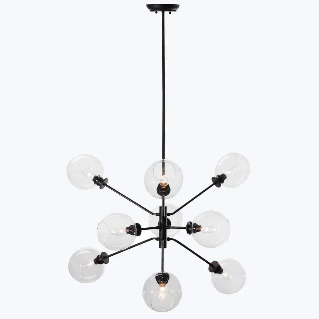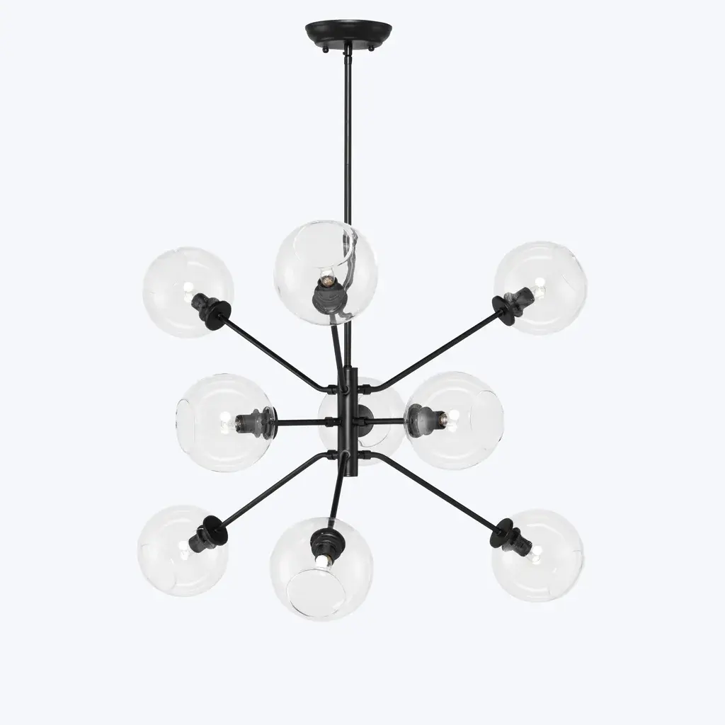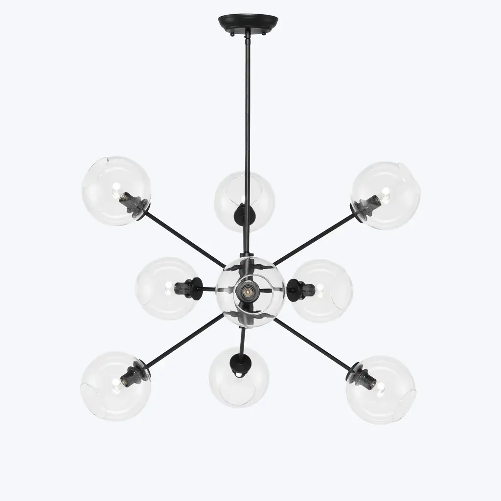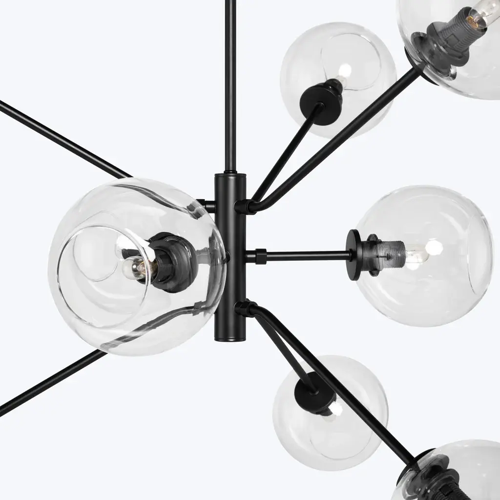 The Atom 9-Light Glass Pendant Fixture projects a smart contemporary dynamic into both residential and commercial spaces with its orbs diffusing light in every direction. Featuring nine champagne, clear, or grey glass orbs on articulated multi-directional metal arms, the Atom 9 is a unique urban lighting pendant that expresses a sophisticated modern energy. Beautifully paired with a dimmer switch for easy adjustment and mood matching.