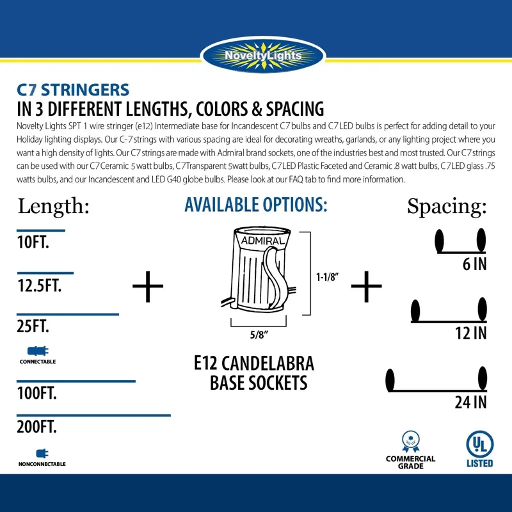 Novelty Lights 10-foot green wire stringer (E12) candelabra base for incandescent and C7 LED bulbs is perfect for creating your stunning holiday lighting extravaganza. Our C7 strings can be used indoors and outdoors for lighting up your roofline, fenceline, trees, and windows. Our C7 strings are made with 10 high quality sockets with each spaced 12” apart and 6" lead/tail wires. Each string comes with a 5 amp fuse with 1 extra fuse included inside the male plug. Bulbs are sold separately.