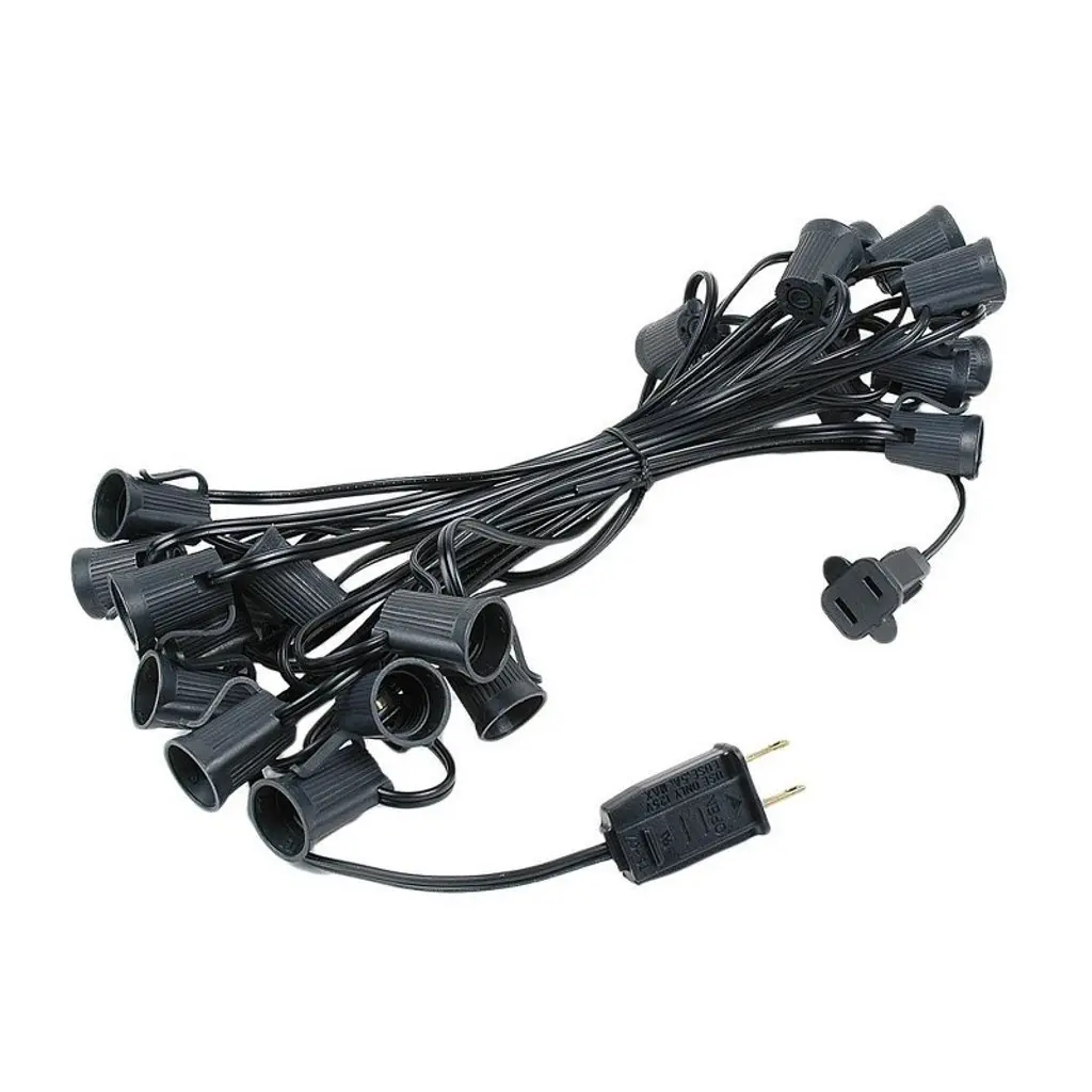 Novelty Lights C9 string light set with 25 bulbs is perfect for outdoor patios, decks, special event or Christmas lighting. Each set includes 25 long life C9 bulbs on a black wire stringer with 25 sockets that are spaced 12" apart. These durable vintage filament clear transparent c9 light strings have long lasting 3,000 hour bulbs and are on a 20 gauge SPT-1 black wire. All our c9 light strings use high quality materials that will stand up to all weathering. These C9 string light sets are great for putting on a roofline, decorating and indoor/outdoor tree, restaurant lighting, wedding events, and much more.