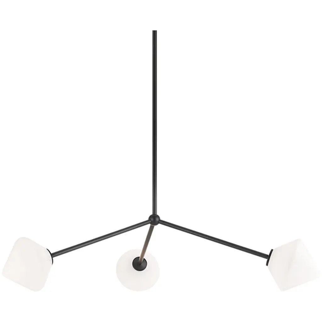 Novo is modern yet classic available in the form of chandelier, wall sconce, and flush mount. The rods and base are either Aged Gold Brass or Black finish paired with a contrasting Opal or Clear round glass and diamond shaped glass. The style is very ve