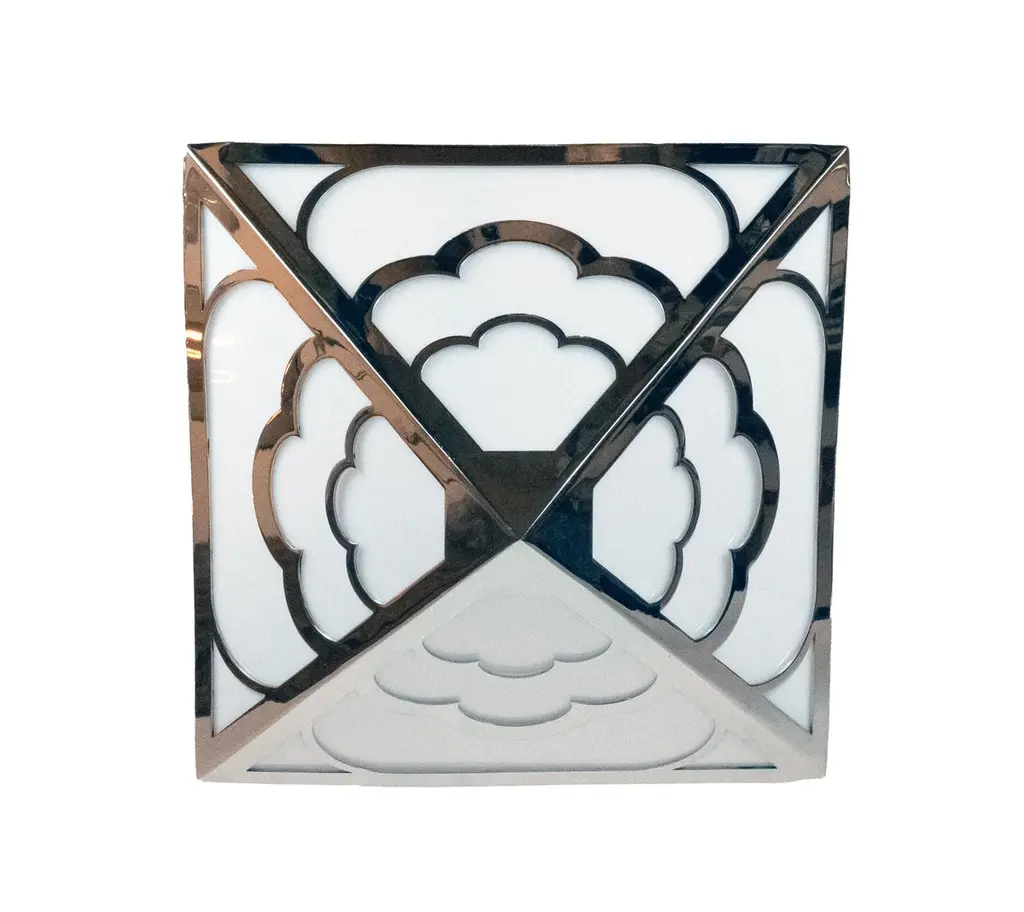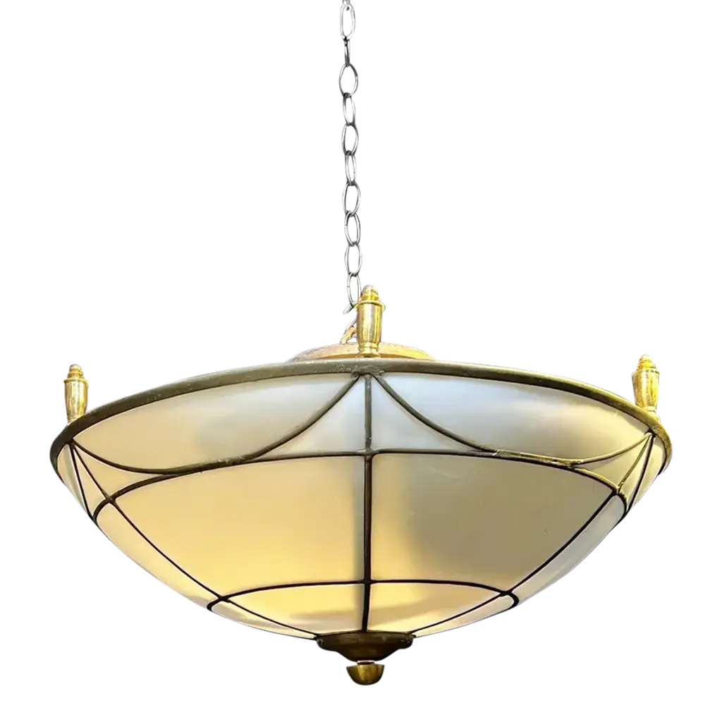A square inverted pyramid shaped Art Deco style ceiling light, the frame with scalloped arches securing hand-blown opalescent glass, the lacquered brass frame, stem and funnel shaped canopy with hammered texture.Four Edison medium base sockets. 400 total maximum wattage. This fixture is customizable in size as well as finish.Founded in 1989, David Duncan is a trusted design resource for custom and ready-made luxury lighting. Our bespoke program offers myriad fabrication and finish possibilities. Produced in the New York area, our designs blend cutting edge technology with traditional, handcrafted artisan techniques. David Duncan offers a dynamic assortment of pieces for today’s luxury interiors, and can accommodate custom projects of any scale.