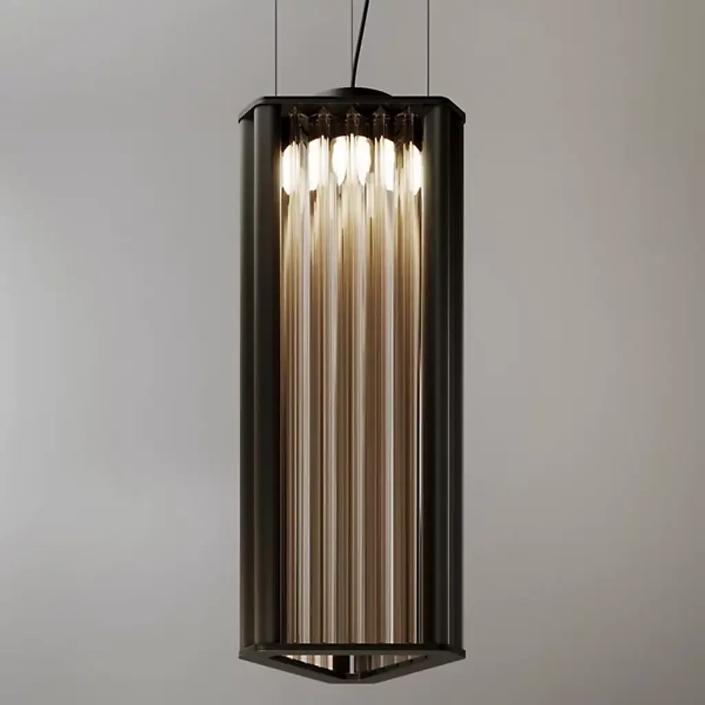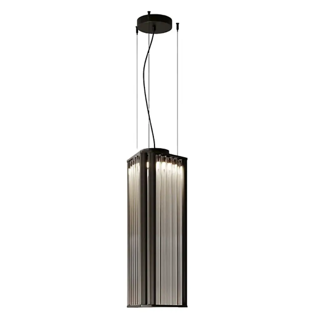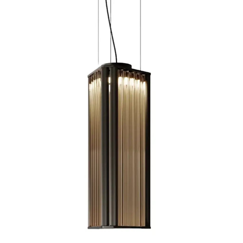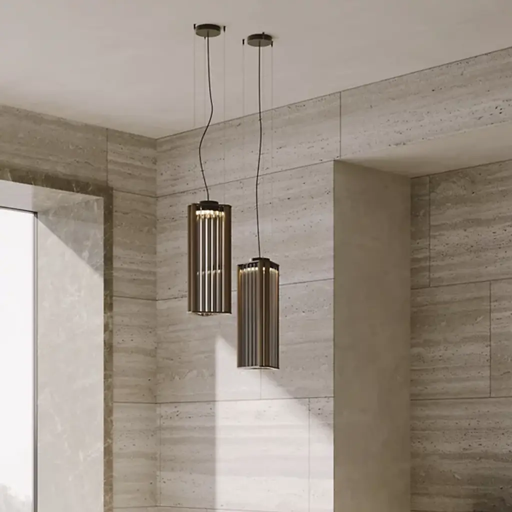 Add artistic intrigue to inside ceilings with the elegant, open lines of the Numa LED Pendant from Venicem. An evocative structure that obtains its inspiration from the classic columnar constructions of ancient architecture, it places vertical glass rods into a triangular brass frame, uniting smooth-surfaced refinement with a touch of glossy glass inside. The parallel rods contrast well with the rounded frame elements, casting a mix of focused downlight accentuated by softened warmth around it.